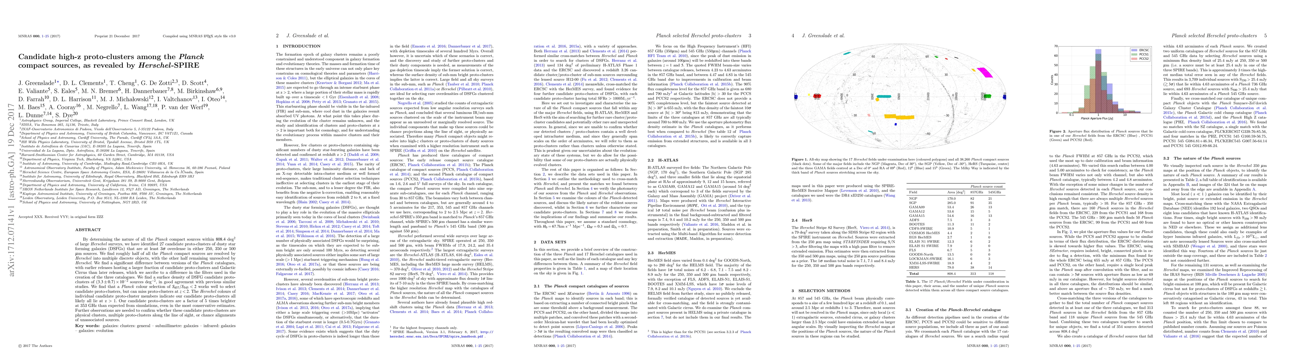 By determining the nature of all the Planck compact sources within 808.4 deg^2 of large Herschel surveys, we have identified 27 candidate proto-clusters of dusty star forming galaxies (DSFGs) that are at least 3{\sigma} overdense in either 250, 350 or 500 $\mu$mm sources. We find roughly half of all the Planck compact sources are resolved by Herschel into multiple discrete objects, with the other half remaining unresolved by Herschel. We find a significant difference between versions of the Planck catalogues, with earlier releases hosting a larger fraction of candidate proto-clusters and Galactic Cirrus than later releases, which we ascribe to a difference in the filters used in the creation of the three catalogues. We find a surface density of DSFG candidate proto-clusters of (3.3 $\pm$ 0.7) x 10^(-2) sources deg^(-2), in good agreement with previous similar studies. We find that a Planck colour selection of S_{857}/S_{545} < 2 works well to select candidate proto-clusters, but can miss proto-clusters at z < 2. The Herschel colours of individual candidate proto-cluster members indicate our candidate proto-clusters all likely all lie at z > 1. Our candidate proto-clusters are a factor of 5 times brighter at 353 GHz than expected from simulations, even in the most conservative estimates. Further observations are needed to confirm whether these candidate proto-clusters are physical clusters, multiple proto-clusters along the line of sight, or chance alignments of unassociated sources.
