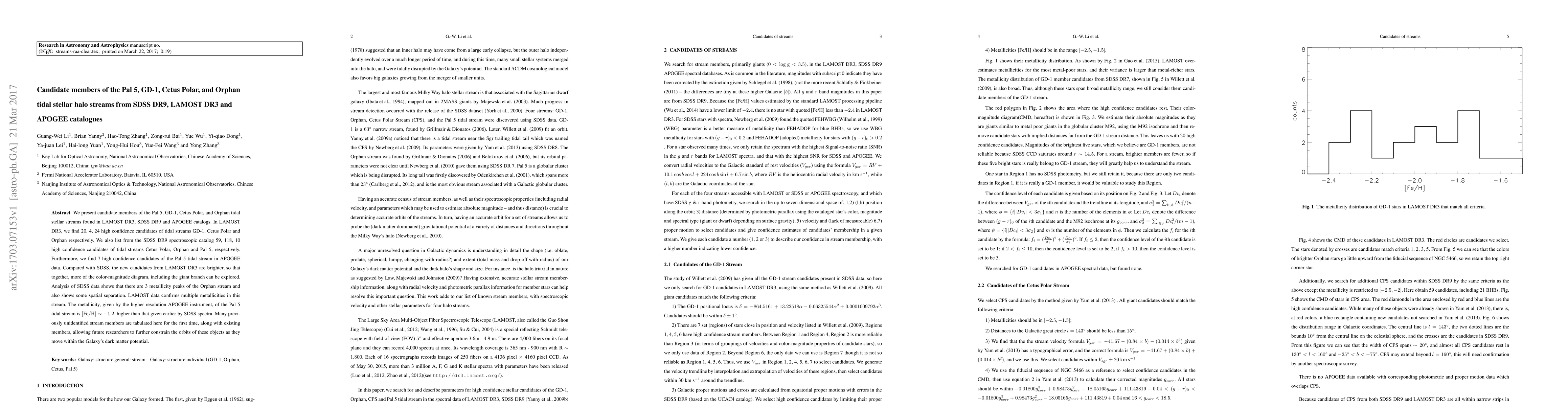 This paper identifies candidate members of the Pal 5, GD-1, Cetus Polar, and Orphan tidal stellar streams using data from LAMOST DR3, SDSS DR9, and APOGEE catalogs. It reports new high-confidence candidates, particularly from LAMOST DR3, which are brighter, allowing deeper exploration of the color-magnitude diagram. The study reveals multiple metallicity peaks in the Orphan stream and higher metallicity for Pal 5 than previously reported.