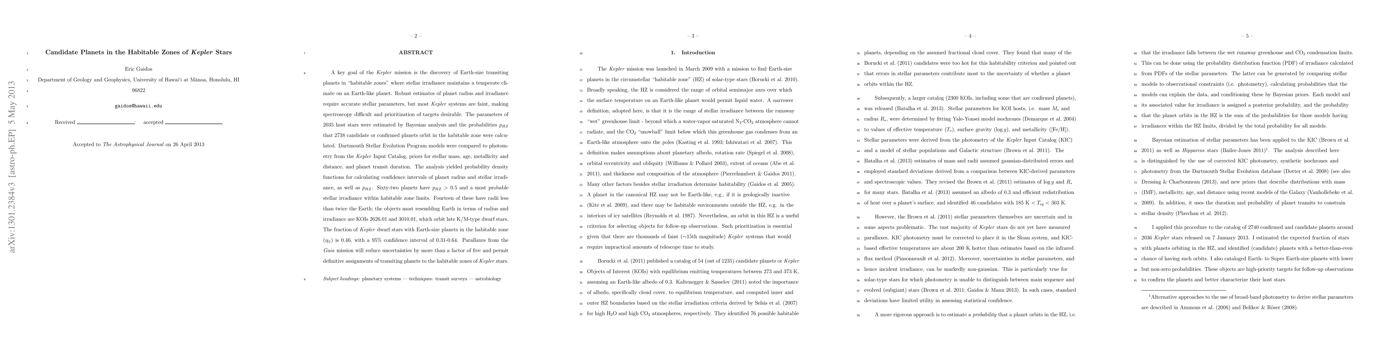 A key goal of the Kepler mission is the discovery of Earth-size transiting planets in "habitable zones" where stellar irradiance maintains a temperate climate on an Earth-like planet. Robust estimates of planet radius and irradiance require accurate stellar parameters, but most Kepler systems are faint, making spectroscopy difficult and prioritization of targets desirable. The parameters of 2035 host stars were estimated by Bayesian analysis and the probabilities p(HZ) that 2738 candidate or confirmed planets orbit in the habitable zone were calculated. Dartmouth Stellar Evolution Program models were compared to photometry from the Kepler Input Catalog, priors for stellar mass, age, metallicity and distance, and planet transit duration. The analysis yielded probability density functions for calculating confidence intervals of planet radius and stellar irradiance, as well as p(HZ). Sixty-two planets have p(HZ) > 0.5 and a most probable stellar irradiance within habitable zone limits. Fourteen of these have radii less than twice the Earth; the objects most resembling Earth in terms of radius and irradiance are KOIs 2626.01 and 3010.01, which orbit late K/M-type dwarf stars. The fraction of Kepler dwarf stars with Earth-size planets in the habitable zone (eta-Earth) is 0.46, with a 95% confidence interval of 0.31-0.64. Parallaxes from the Gaia mission will reduce uncertainties by more than a factor of five and permit definitive assignments of transiting planets to the habitable zones of Kepler stars.