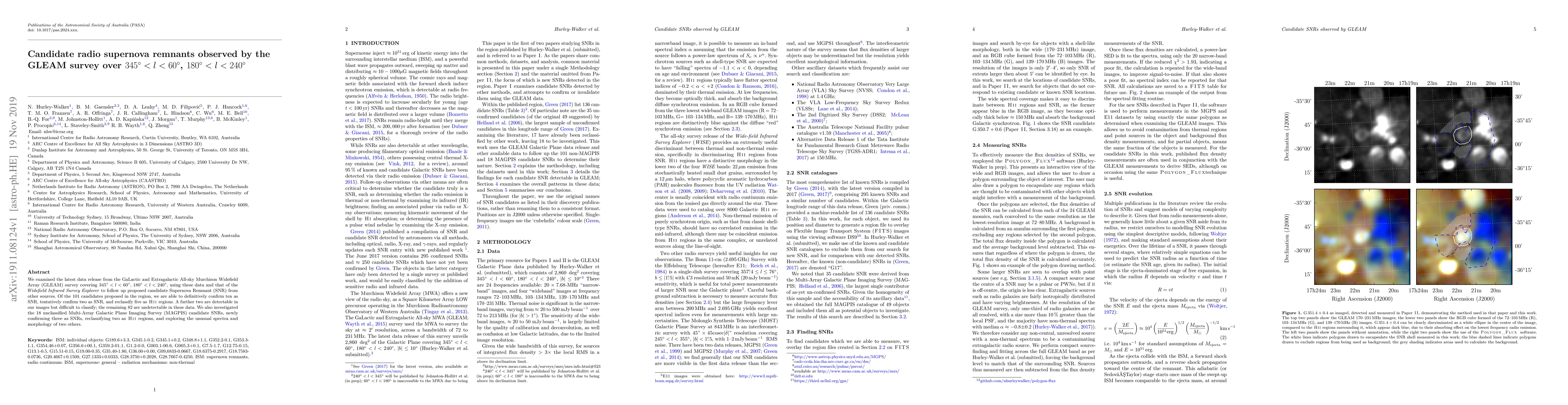 We examined the latest data release from the GaLactic and Extragalactic All-sky Murchison Widefield Array (GLEAM) survey covering $345^\circ < l < 60^\circ$, $180^\circ < l < 240^\circ$, using these data and that of the Widefield Infrared Survey Explorer to follow up proposed candidate Supernova Remnants from other sources. Of the 101 candidates proposed in the region, we are able to definitively confirm ten as SNRs, tentatively confirm two as SNRs, and reclassify five as Hii regions. A further two are detectable in our images but difficult to classify; the remaining 82 are undetectable in these data. We also investigated the 18 unclassified Multi-Array Galactic Plane Imaging Survey (MAGPIS) candidate SNRs, newly confirming three as SNRs, reclassifying two as Hii regions, and exploring the unusual spectra and morphology of two others.