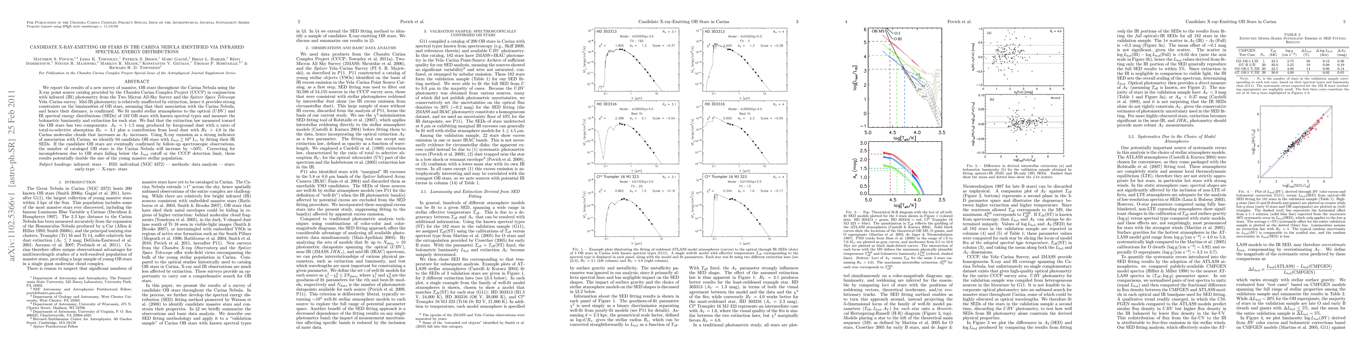 This study identifies 94 candidate X-ray-emitting OB stars in the Carina Nebula using infrared spectral energy distributions and X-ray data, potentially doubling the known population of massive OB stars in the region. The research combines infrared photometry and model stellar atmospheres to estimate luminosities and extinction, revealing a complex extinction law with two components.