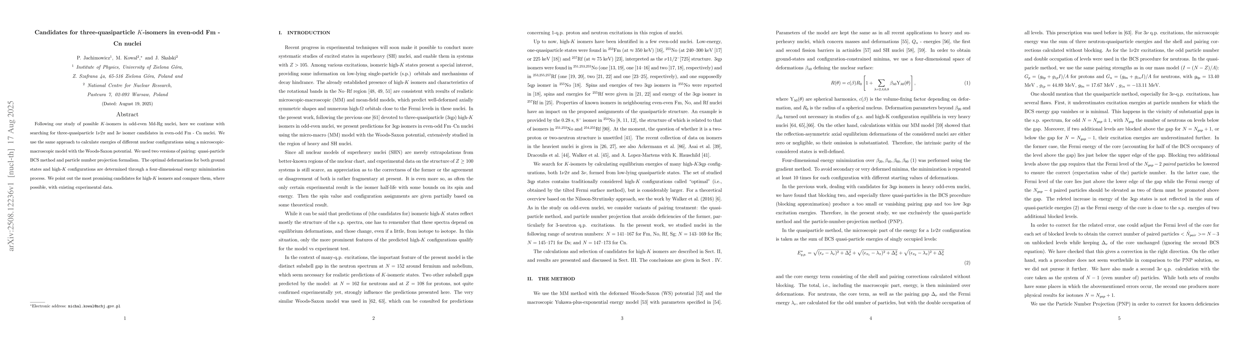 Following our study of possible $K$-isomers in odd-even Md-Rg nuclei, here we continue with searching for three-quasiparticle 1$\nu$2$\pi$ and 3$\nu$ isomer candidates in even-odd Fm - Cn nuclei. We use the same approach to calculate energies of different nuclear configurations using a microscopic-macroscopic model with the Woods-Saxon potential. We used two versions of pairing: quasi-particle BCS method and particle number projection formalism. The optimal deformations for both ground states and high-$K$ configurations are determined through a four-dimensional energy minimization process. We point out the most promising candidates for high-$K$ isomers and compare them, where possible, with existing experimental data.