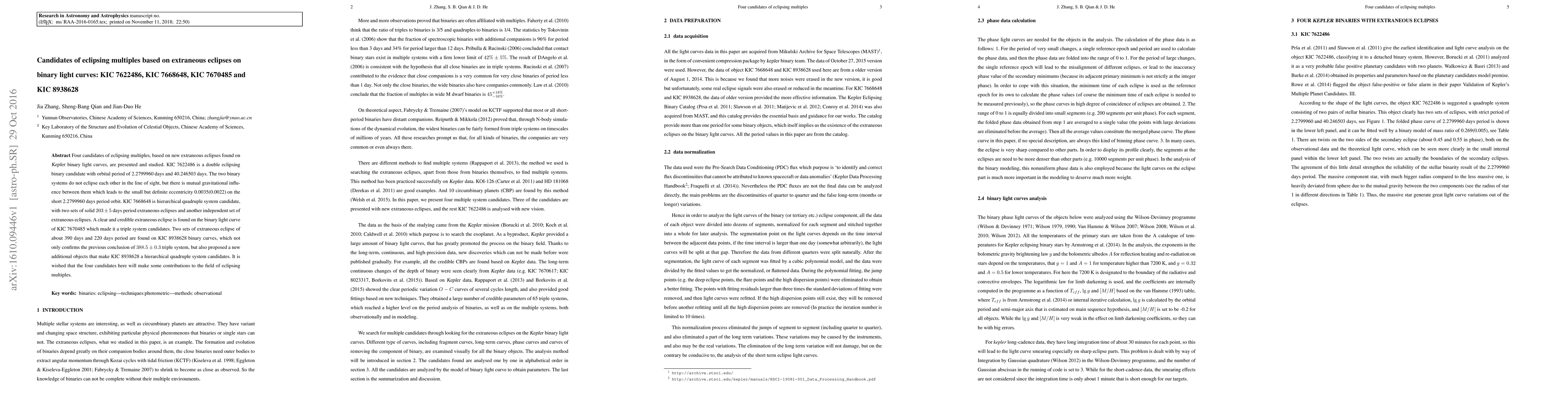 Four candidates of eclipsing multiples, based on new extraneous eclipses found on Kepler binary light curves, are presented and studied. KIC 7622486 is a double eclipsing binary candidate with orbital period of 2.2799960 days and 40.246503 days. The two binary systems do not eclipse each other in the line of sight, but there is mutual gravitational influence between them which leads to the small but definite eccentricity 0.0035(0.0022) on the short 2.2799960 days period orbit. KIC 7668648 is hierarchical quadruple system candidate, with two sets of solid 203(+-5) days period extraneous eclipses and another independent set of extraneous eclipses. A clear and credible extraneous eclipse is found on the binary light curve of KIC 7670485 which made it a triple system candidates. Two sets of extraneous eclipse of about 390 days and 220 days period are found on KIC 8938628 binary curves, which not only confirms the previous conclusion of $388.5(+-0.3) triple system, but also proposed a new additional objects that make KIC 8938628 a hierarchical quadruple system candidates. It is wished that the four candidates here will make some contributions to the field of eclipsing multiples.