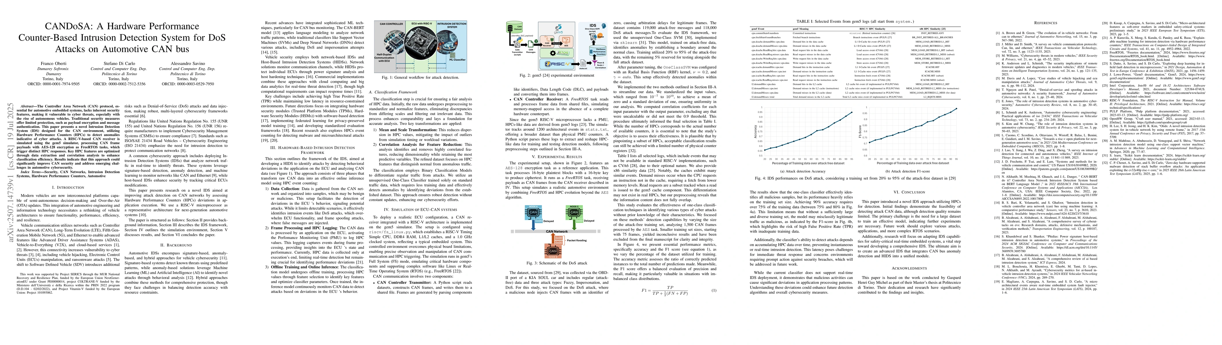 The paper presents a novel hardware-based intrusion detection system (HID) utilizing HPCs for detecting anomalies indicative of cyber attacks on the CAN bus, enhancing automotive cybersecurity.