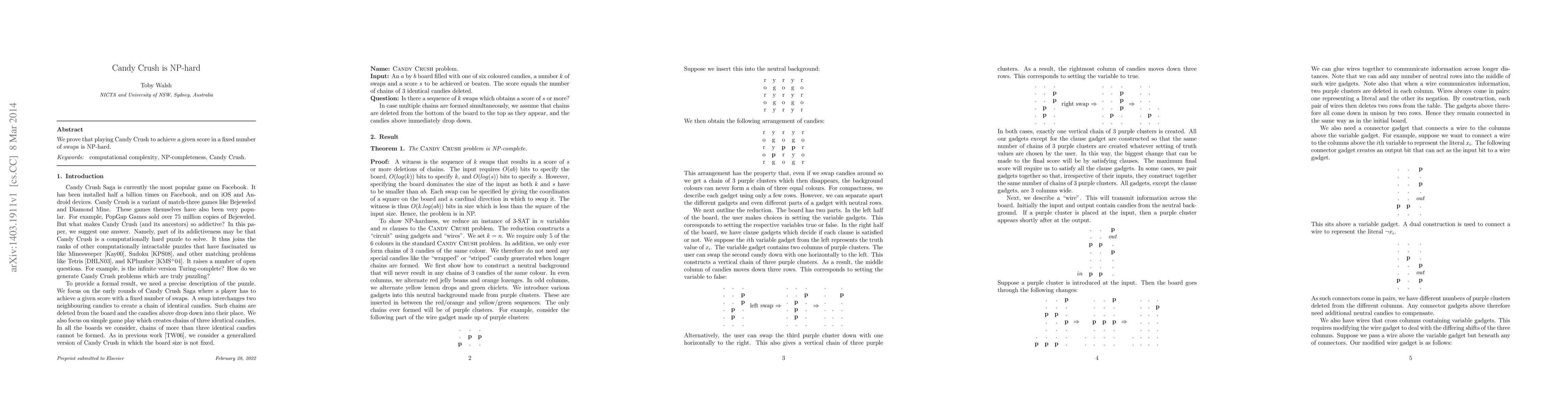 Summary: This paper demonstrates that solving Candy Crush to reach a specified score within a limited number of moves is computationally as difficult as the hardest problems in NP, establishing its NP-hardness.