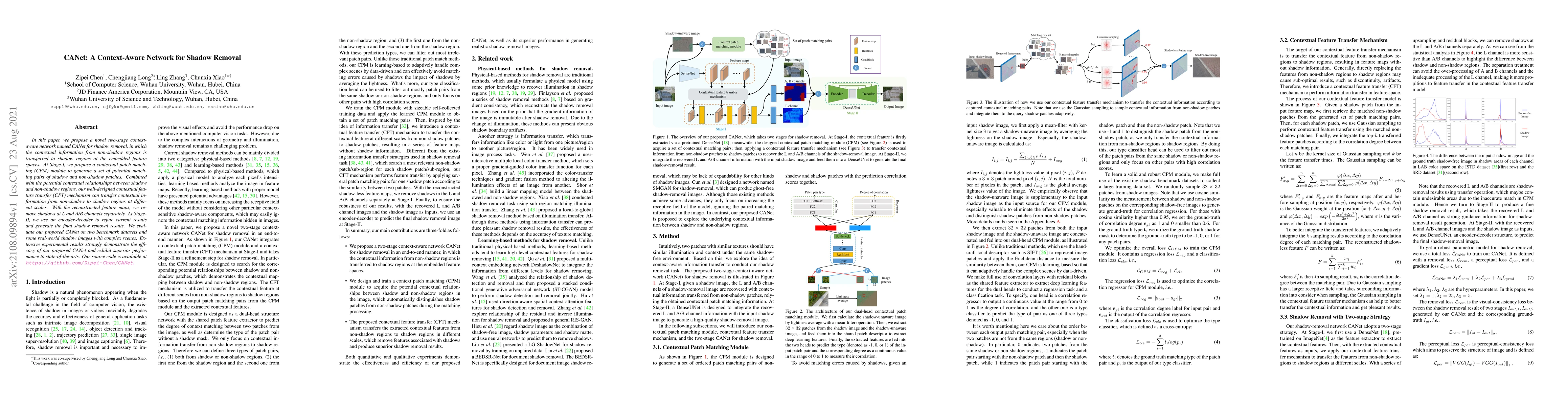 CANet is a two-stage context-aware network for shadow removal that uses a contextual patch matching module to identify and transfer contextual information from non-shadow to shadow regions, followed by an encoder-decoder refinement stage for superior performance.