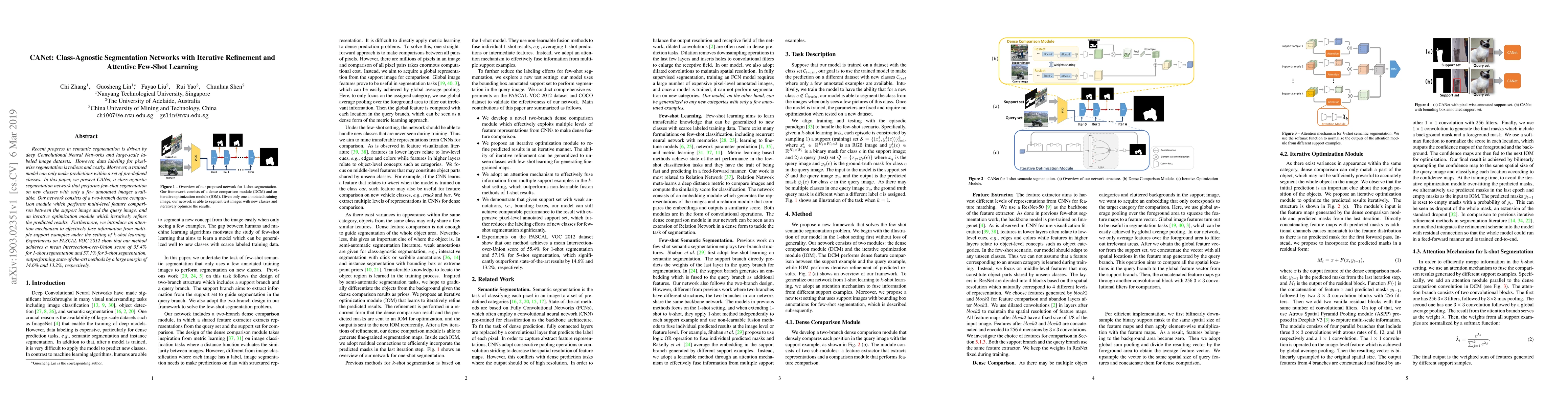 CANet introduces a class-agnostic segmentation network that performs few-shot segmentation with minimal labeled data, utilizing an iterative refinement and attentive few-shot learning approach, achieving superior results on PASCAL VOC 2012 compared to state-of-the-art methods.