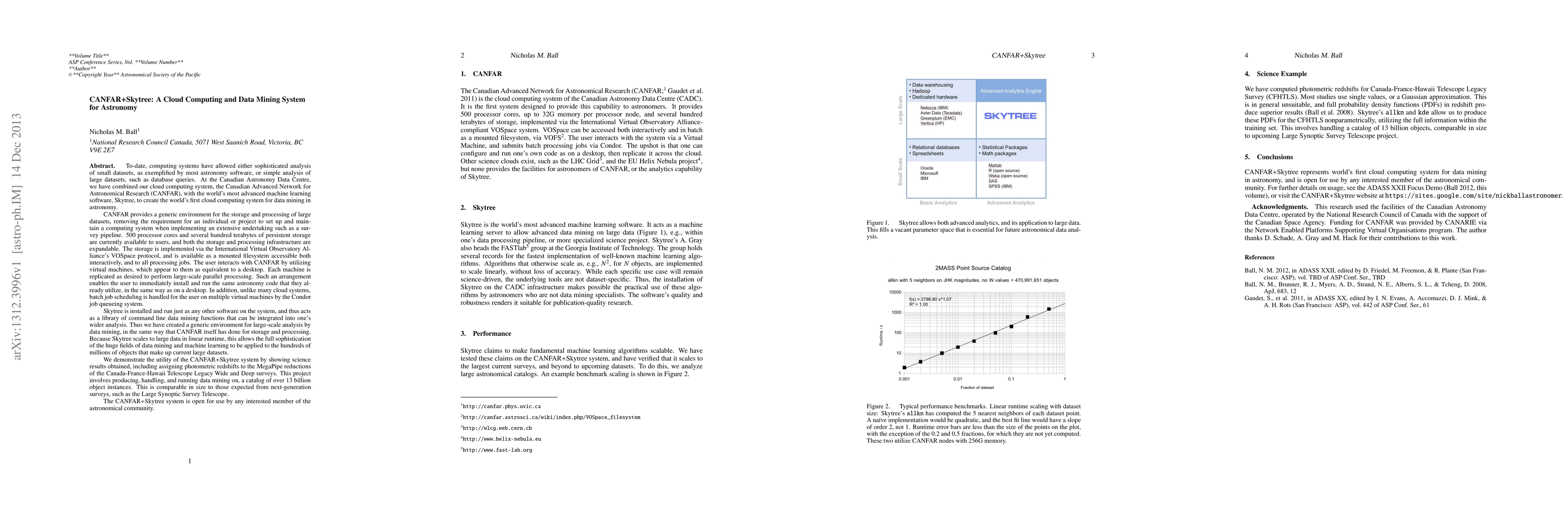The CANFAR+Skytree system integrates cloud computing with advanced machine learning for astronomy data mining, offering scalable storage and processing via cloud infrastructure and machine learning functions for large-scale analysis. Science results demonstrate its effectiveness in handling vast astronomical datasets.
