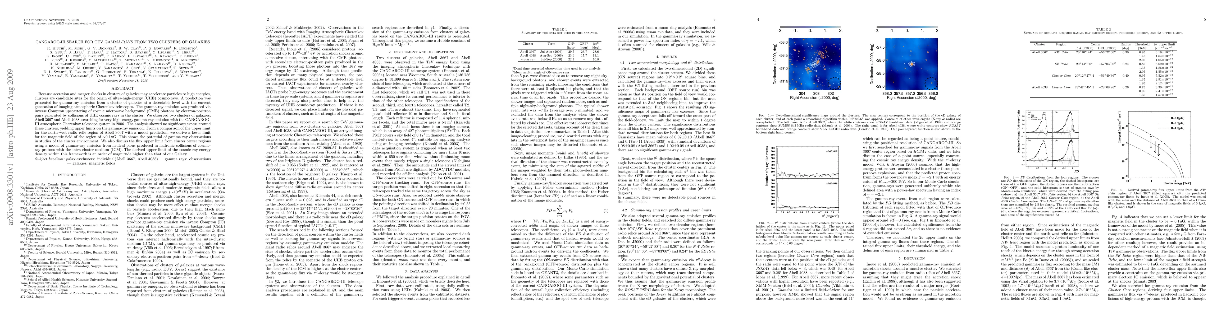 The CANGAROO-III telescope system searched for TeV gamma-rays from two galaxy clusters without detecting any significant excess, yielding upper limits on gamma-ray emission. The study also derived a lower limit for the magnetic field of one cluster region.