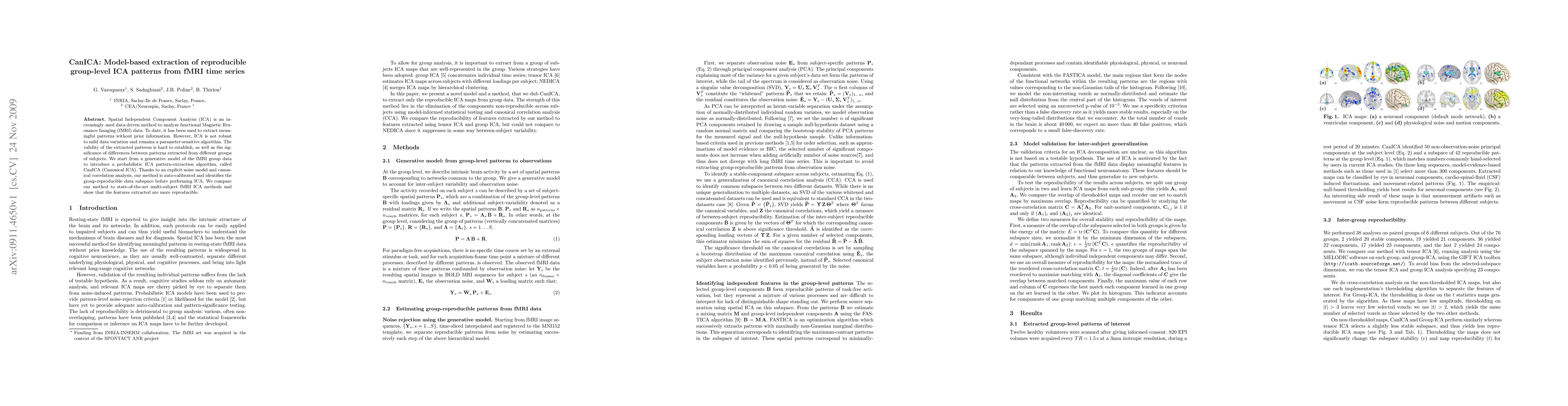 CanICA introduces a probabilistic ICA pattern-extraction algorithm for fMRI data, enhancing reproducibility and robustness by using a generative model and canonical correlation analysis. The method outperforms existing multi-subject fMRI ICA techniques in extracting reproducible group-level patterns.