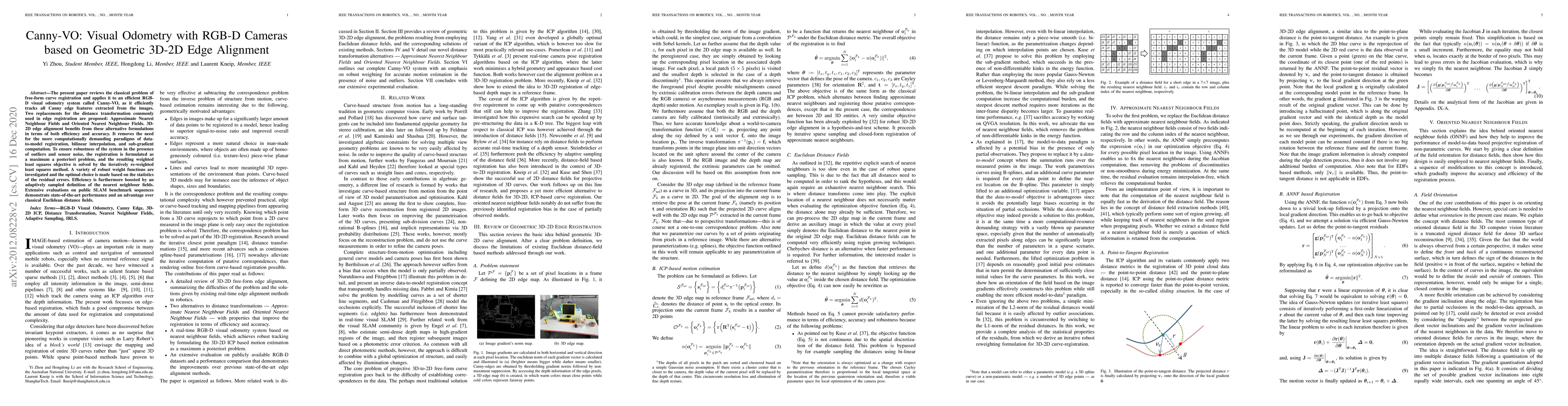 A new visual odometry system called Canny-VO tracks edge features with improved efficiency and accuracy using 3D-2D edge alignment, achieving state-of-the-art performance on public SLAM benchmark sequences.