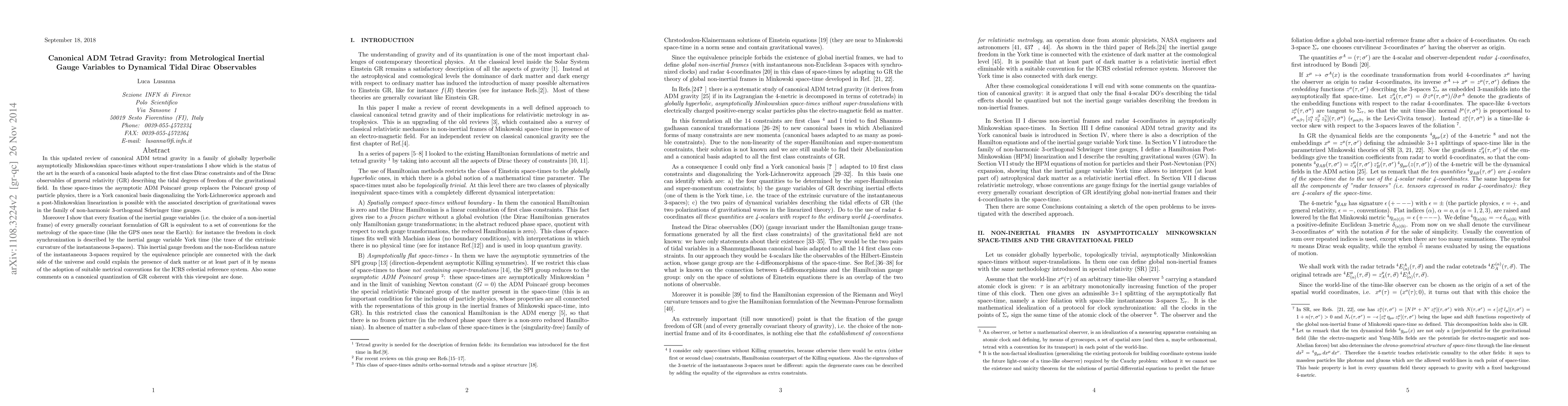 Dirac constraint theory allows to identify the York canonical basis (diagonalizing the York-Lichnerowicz approach) in ADM tetrad gravity for asymptotically Minkowskian space-times without super-translations. This allows to identify the inertial (gauge) and tidal (physical) degrees of freedom of the gravitational field and to interpret Ashtekar variables in these space-times. The use of radar 4-coordinates centered on a time-like observer allows to connect the 3+1 splittings of space-time with the relativistic metrology used in atomic physics and astronomy. The asymptotic ADM Poincar\'e group replaces the Poincar\'e group of particle physics. The general relativistic remnant of the gauge freedom in clock synchronization is described by the inertial gauge variable ${}^3K$, the trace of the extrinsic curvature of the non-Euclidean 3-spaces. The theory can be linearized in a Post-Minkowskian way by using the asymptotic Minkowski metric as an asymptotic background at spatial infinity and the family of non-harmonic 3-orthogonal Schwinger time gauges allows to reproduce the known results on gravitational waves in harmonic gauges. It is shown that the main signatures for the existence of dark matter can be reinterpreted as an relativistic inertial effect induced by ${}^3K$: while in the space-time inertial and gravitational masses coincide (equivalence principle), this is not true in the non-Euclidean 3-spaces (breaking of Newton equivalence principle), where the inertial mass has extra ${}^3K$-dependent terms simulating dark matter. Therefore a Post-Minkowskian extension of the existing Post-Newtonian celestial reference frame is needed.