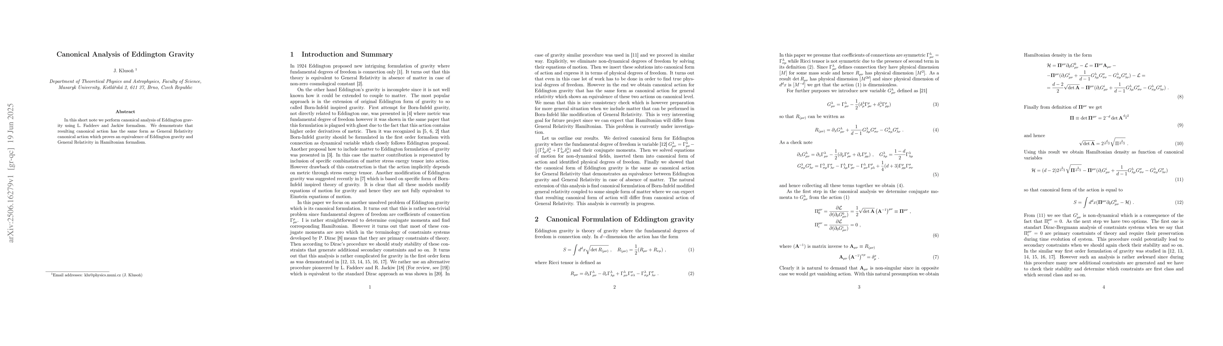 In this short note we perform canonical analysis of Eddington gravity using L. Faddeev and Jackiw formalism. We demonstrate that resulting canonical action has the same form as General Relativity canonical action which proves an equivalence of Eddington gravity and General Relativity in Hamiltonian formalism.