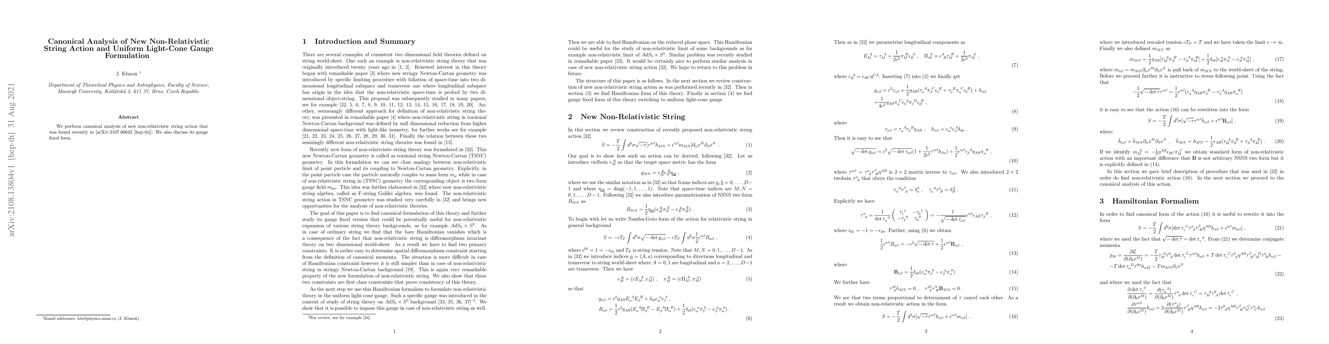 Summary: This paper conducts a canonical analysis of a recently discovered non-relativistic string action and explores its uniform light-cone gauge formulation, providing insights into its gauge-fixed form.