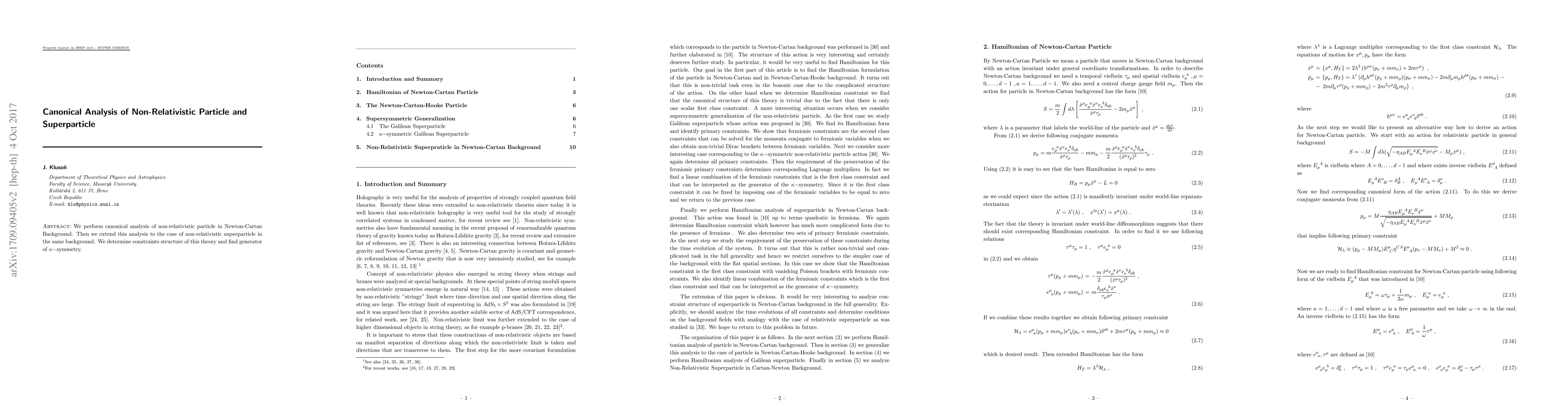 We perform canonical analysis of non-relativistic particle in Newton-Cartan Background. Then we extend this analysis to the case of non-relativistic superparticle in the same background. We determine constraints structure of this theory and find generator of \kappa-symmetry.