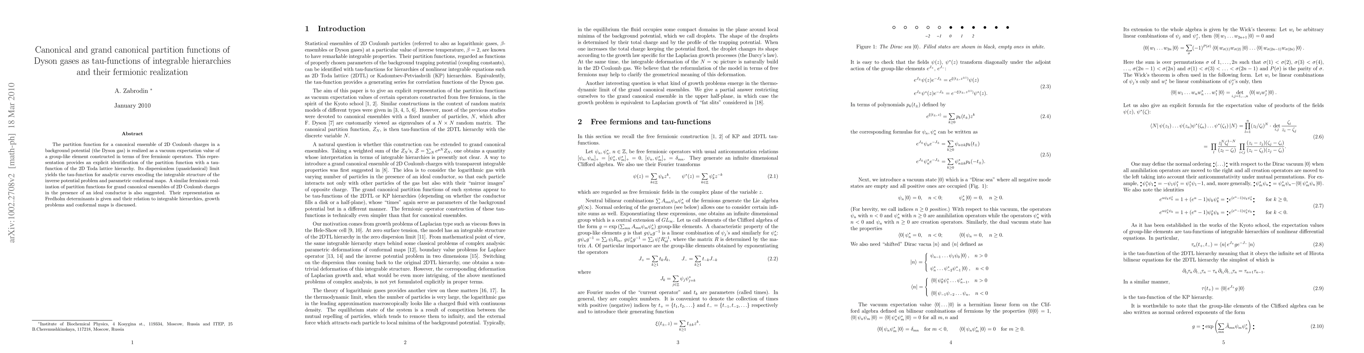 This paper establishes a connection between the partition functions of Dyson gases and tau-functions of integrable hierarchies, using free fermionic operators for their representation. It also explores the quasiclassical limit and its relation to conformal maps, extending the analysis to grand canonical ensembles.