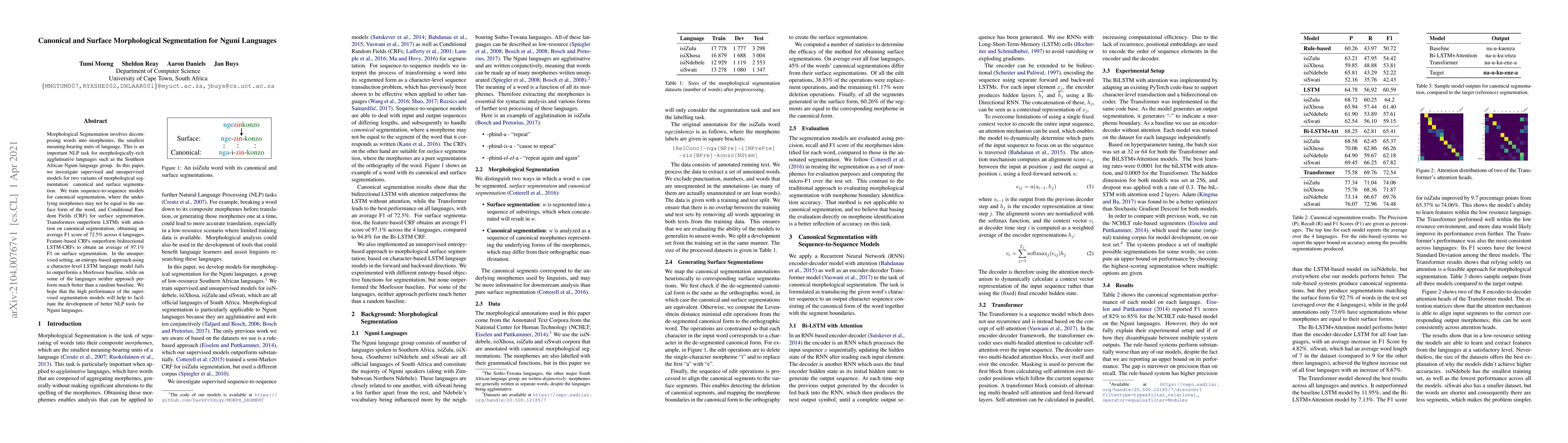 This paper explores supervised and unsupervised models for morphological segmentation in Nguni languages, achieving higher F1 scores with Transformers for canonical segmentation and CRFs for surface segmentation. Unsupervised methods show limited improvement over baselines.