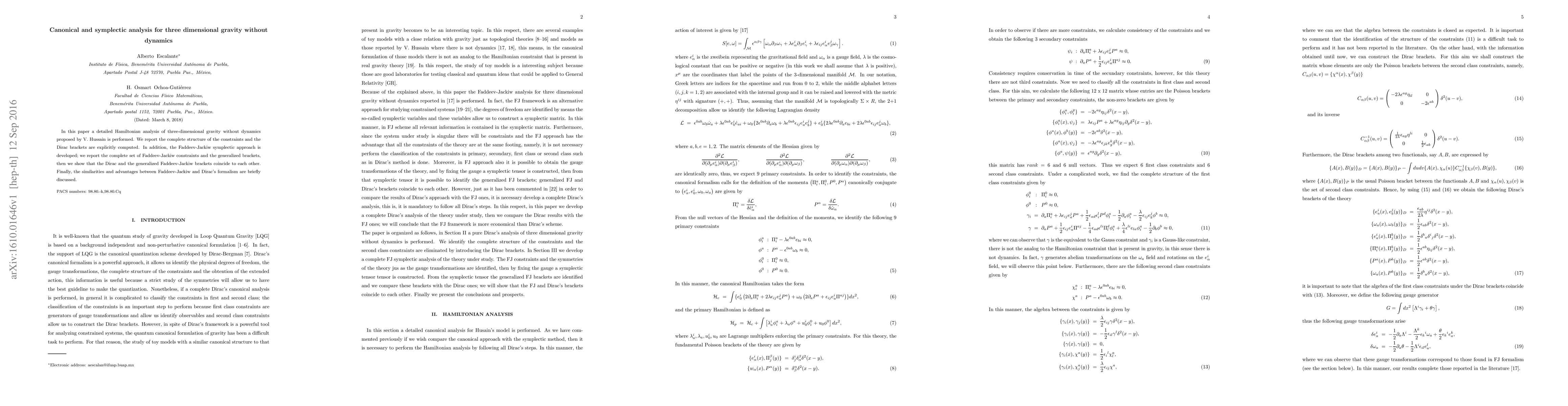 In this paper a detailed Hamiltonian analysis of three-dimensional gravity without dynamics proposed by V. Hussain is performed. We report the complete structure of the constraints and the Dirac brackets are explicitly computed. In addition, the Faddeev-Jackiw symplectic approach is developed; we report the complete set of Faddeev-Jackiw constraints and the generalized brackets, then we show that the Dirac and the generalized Faddeev-Jackiw brackets coincide to each other. Finally, the similarities and advantages between Faddeev-Jackiw and Dirac's formalism are briefly discussed.