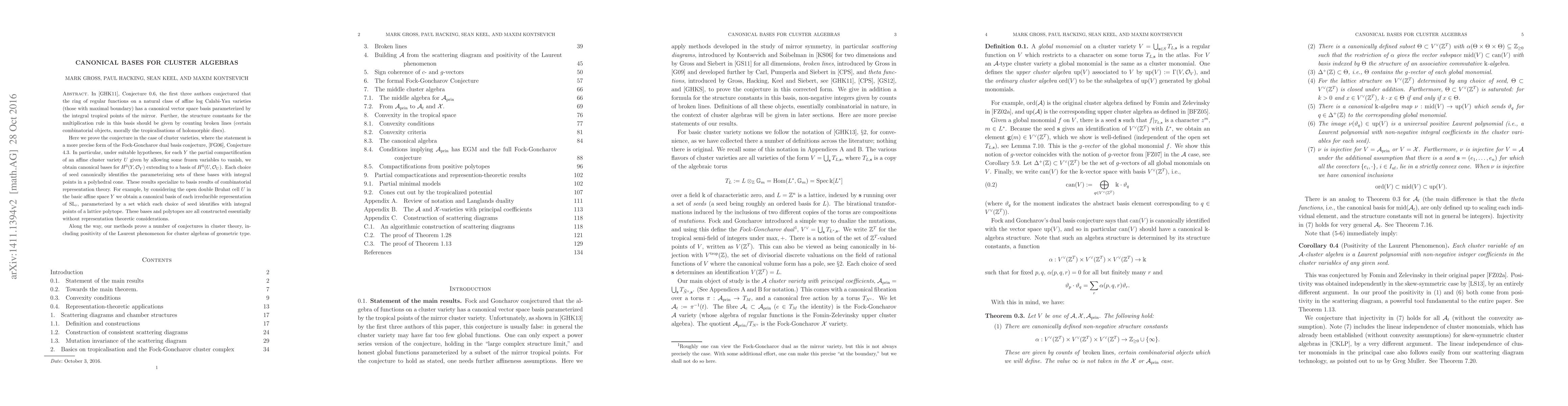 This paper proves a conjecture regarding canonical bases for the ring of functions on cluster varieties, parameterized by tropical points. It establishes these bases via combinatorial objects and constructs them without representation theory, with applications to combinatorial representation theory and cluster theory.