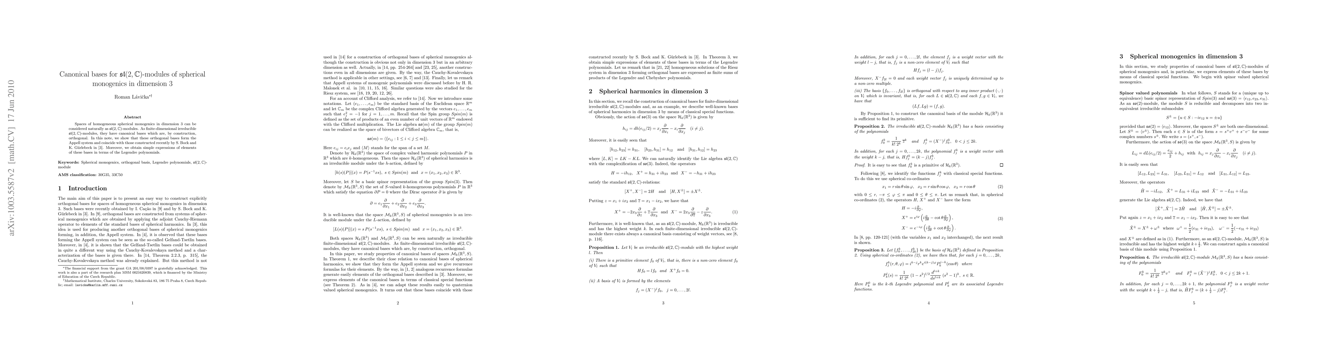 Spaces of homogeneous spherical monogenics in dimension 3 can be considered naturally as sl(2,C)-modules. As finite-dimensional irreducible sl(2,C)-modules, they have canonical bases which are, by construction, orthogonal. In this note, we show that these orthogonal bases form the Appell system and coincide with those constructed recently by S. Bock and K. Guerlebeck. Moreover, we obtain simple expressions of elements of these bases in terms of the Legendre polynomials.