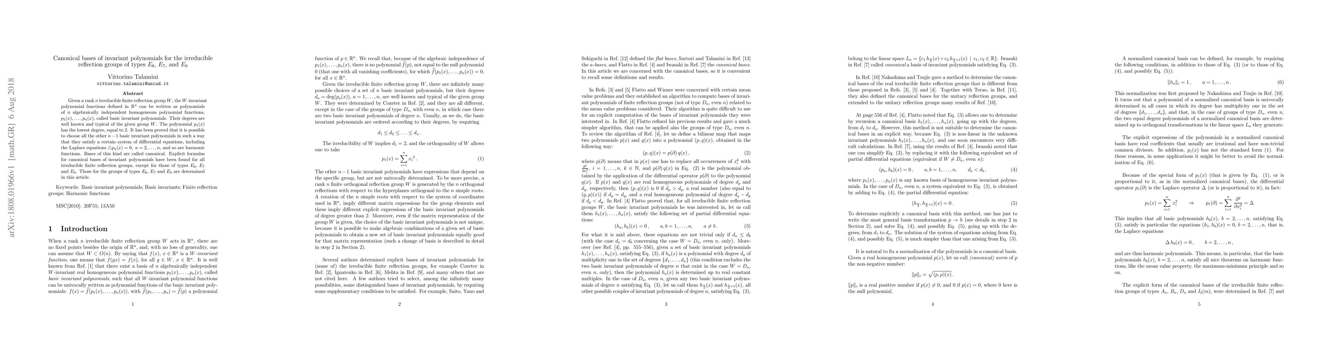Given a rank $n$ irreducible finite reflection group $W$, the $W$-invariant polynomial functions defined in ${\mathbb R}^n$ can be written as polynomials of $n$ algebraically independent homogeneous polynomial functions, $p_1(x),\ldots,p_n(x)$, called basic invariant polynomials. Their degrees are well known and typical of the given group $W$. The polynomial $p_1(x)$ has the lowest degree, equal to 2. It has been proved that it is possible to choose all the other $n-1$ basic invariant polynomials in such a way that they satisfy a certain system of differential equations, including the Laplace equations $\triangle p_a(x)=0,\ a=2,\ldots,n$, and so are harmonic functions. Bases of this kind are called canonical. Explicit formulas for canonical bases of invariant polynomials have been found for all irreducible finite reflection groups, except for those of types $E_6$, $E_7$ and $E_8$. Those for the groups of types $E_6$, $E_7$ and $E_8$ are determined in this article.