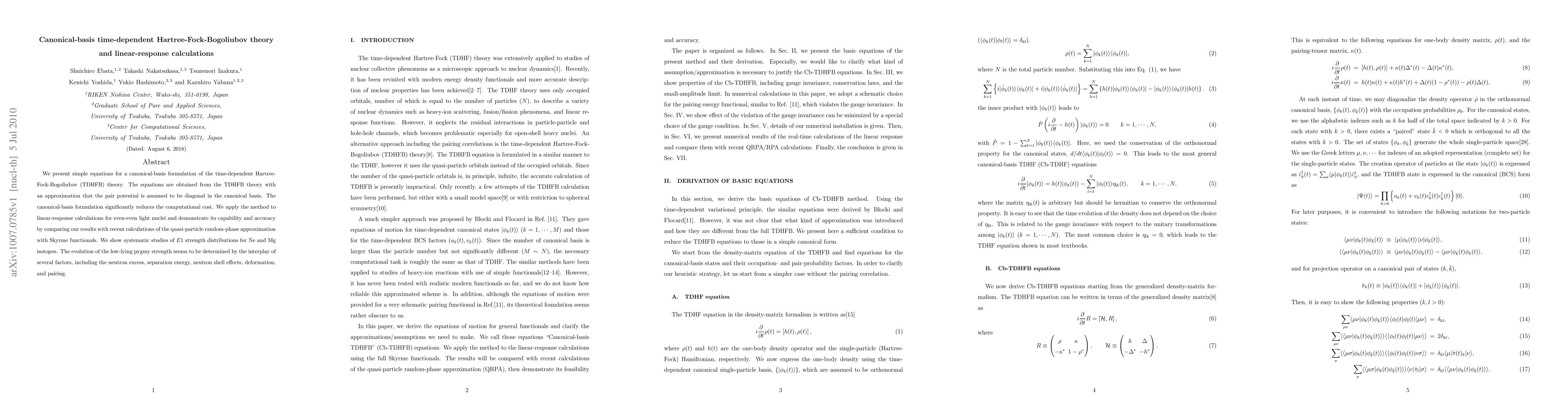 This paper introduces a simplified canonical-basis formulation of time-dependent Hartree-Fock-Bogoliubov theory, significantly reducing computational costs, and applies it to linear-response calculations for light even-even nuclei, demonstrating its accuracy through comparisons with quasi-particle random-phase approximation results.