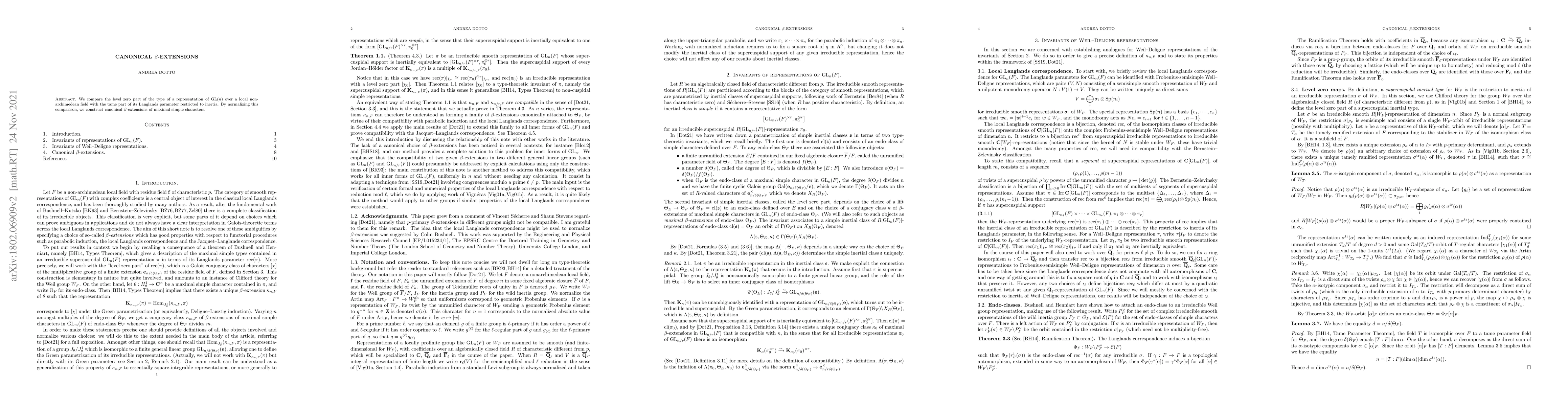 We compare the level zero part of the type of a representation of GL(n) over a non-archimedean local field with the tame part of its Langlands parameter restricted to inertia. By normalizing this comparison, we construct canonical $\beta$-extensions of maximal simple characters.