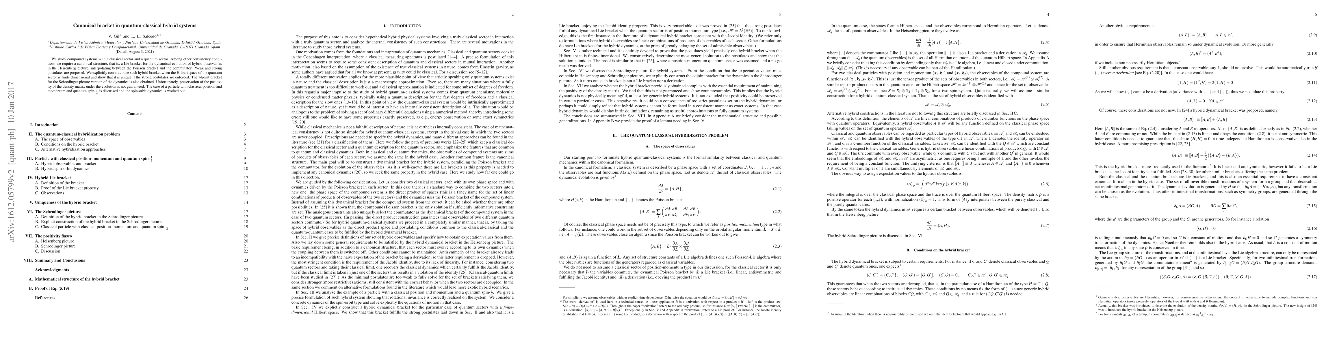 We study compound systems with a classical sector and a quantum sector. Among other consistency conditions we require a canonical structure, that is, a Lie bracket for the dynamical evolution of hybrid observables in the Heisenberg picture, interpolating between the Poisson bracket and the commutator. Weak and strong postulates are proposed. We explicitly construct one such hybrid bracket when the Hilbert space of the quantum sector is finite dimensional and show that it is unique if the strong postulates are enforced. The adjoint bracket for the Schrodinger picture version of the dynamics is also obtained. Unfortunately, preservation of the positivity of the density matrix under the evolution is not guaranteed. The case of a particle with classical position and momentum and quantum spin-$\frac{1}{2}$ is discussed and the spin-orbit dynamics is worked out.
