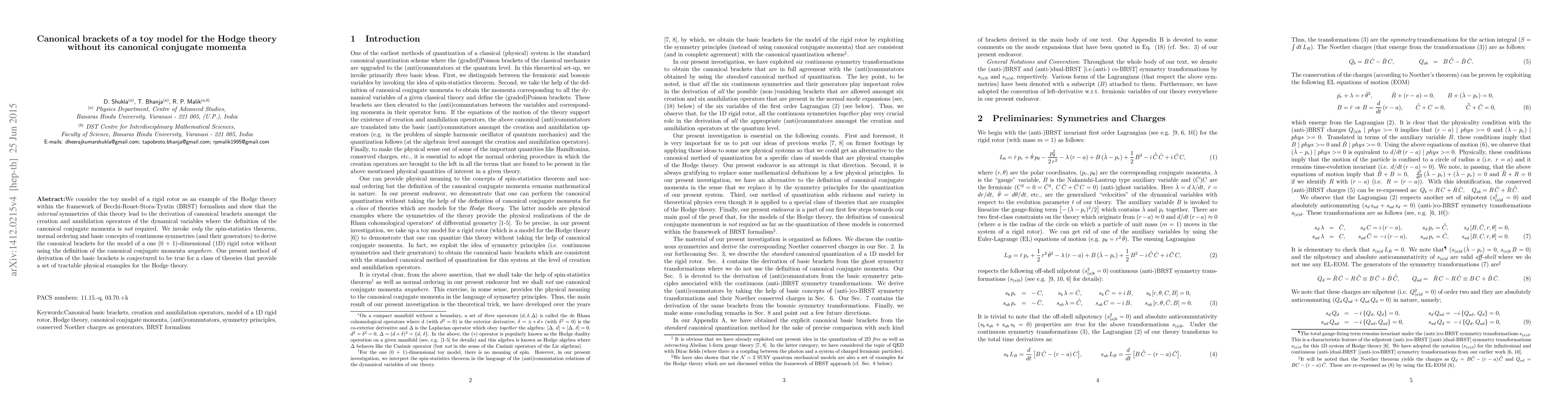 We consider the toy model of a rigid rotor as an example of the Hodge theory within the framework of the Becchi-Rouet-Stora-Tyutin (BRST) formalism and show that the internal symmetries of this theory lead to the derivation of canonical brackets amongst the creation and annihilation operators of the dynamical variables where the definition of the canonical conjugate momenta is not required. We invoke only the spin-statistics theorem, normal ordering and basic concepts of continuous symmetries (and their generators) to derive the canonical brackets for the model of a one (0 + 1)-dimensional (1D) rigid rotor without using the definition of the canonical conjugate momenta anywhere. Our present method of derivation of the basic brackets is conjectured to be true for a class of theories that provide a set of tractable physical examples for the Hodge theory.