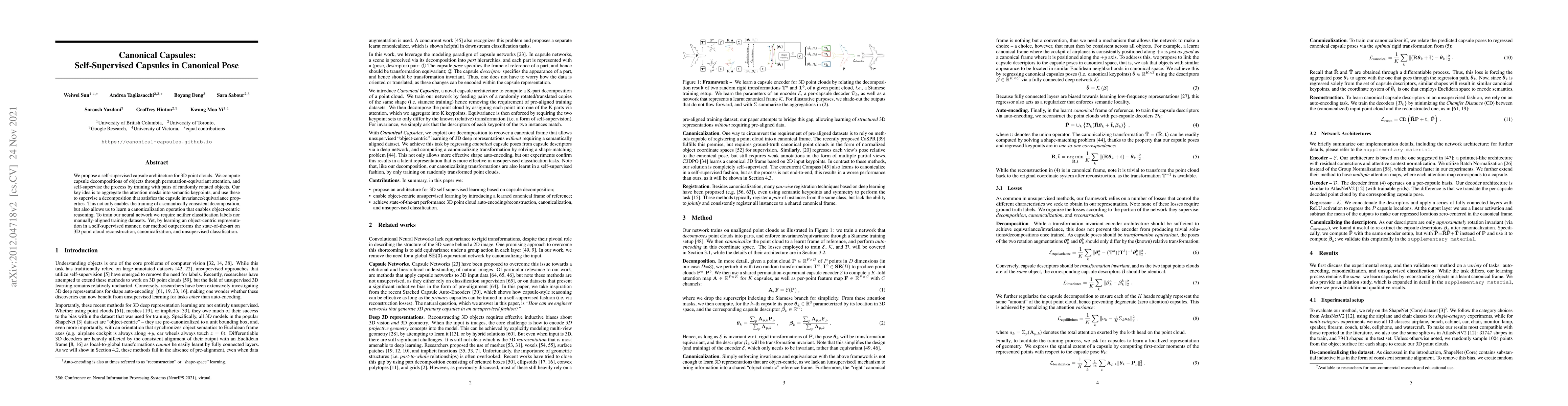 This paper introduces a self-supervised capsule network for 3D point clouds that uses permutation-equivariant attention to decompose objects into semantically consistent parts. It achieves this without labeled data by training on randomly rotated object pairs, leading to superior performance in reconstruction, canonicalization, and unsupervised classification.
