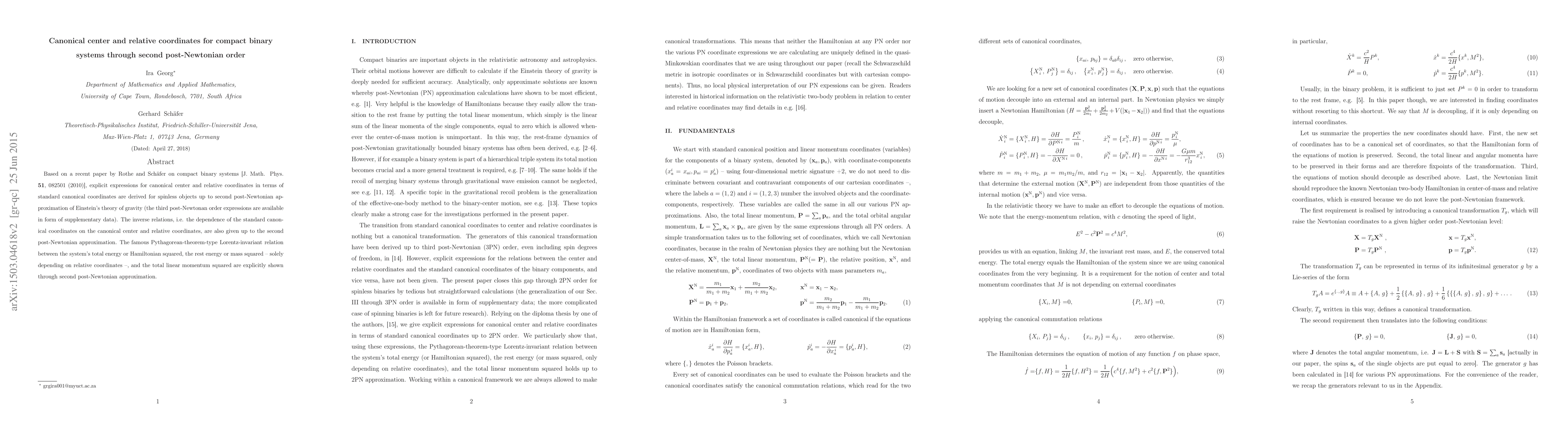 Based on a recent paper by Rothe and Sch\"afer on compact binary systems, explicit expressions for canonical center and relative coordinates in terms of standard canonical coordinates are derived for spinless objects up to second post-Newtonian approximation of Einstein's theory of gravity. The inverse relations, i.e. the dependence of the standard canonical coordinates on the canonical center and relative coordinates, are also given up to the second post-Newtonian approximation. The famous Pythagorean-theorem-type Lorentz-invariant relation between the system's total energy or Hamiltonian squared, the rest energy or mass squared - solely depending on relative coordinates -, and the total linear momentum squared are explicitly shown through second post-Newtonian approximation.