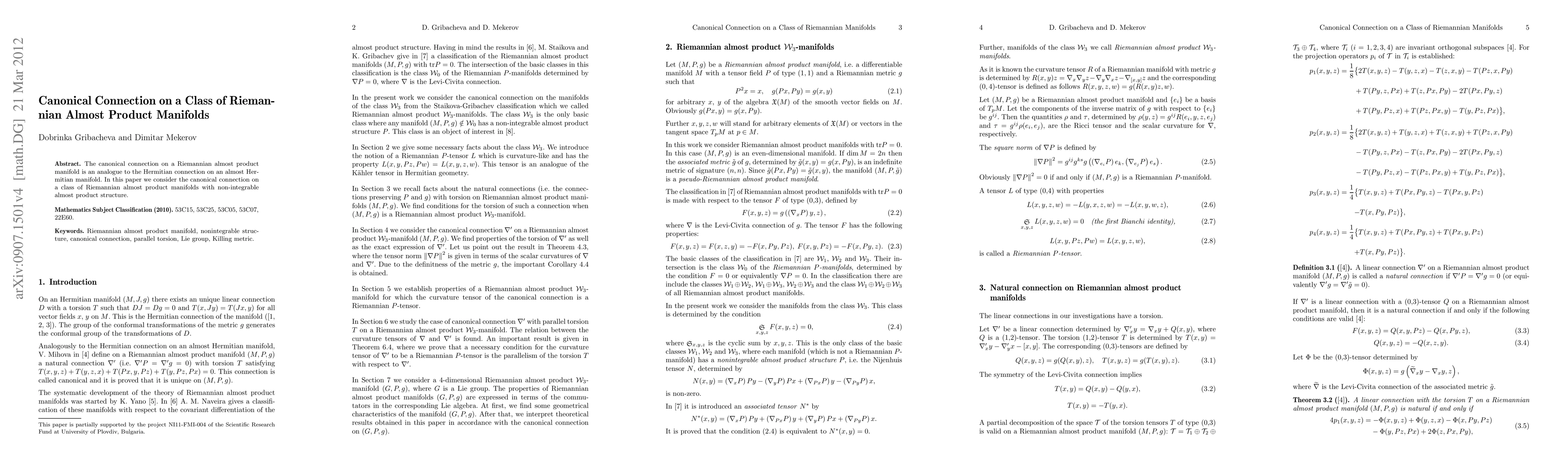 This paper explores the canonical connection on a class of Riemannian almost product manifolds with non-integrable structures, providing a detailed construction and characterization through an example involving a Lie group.