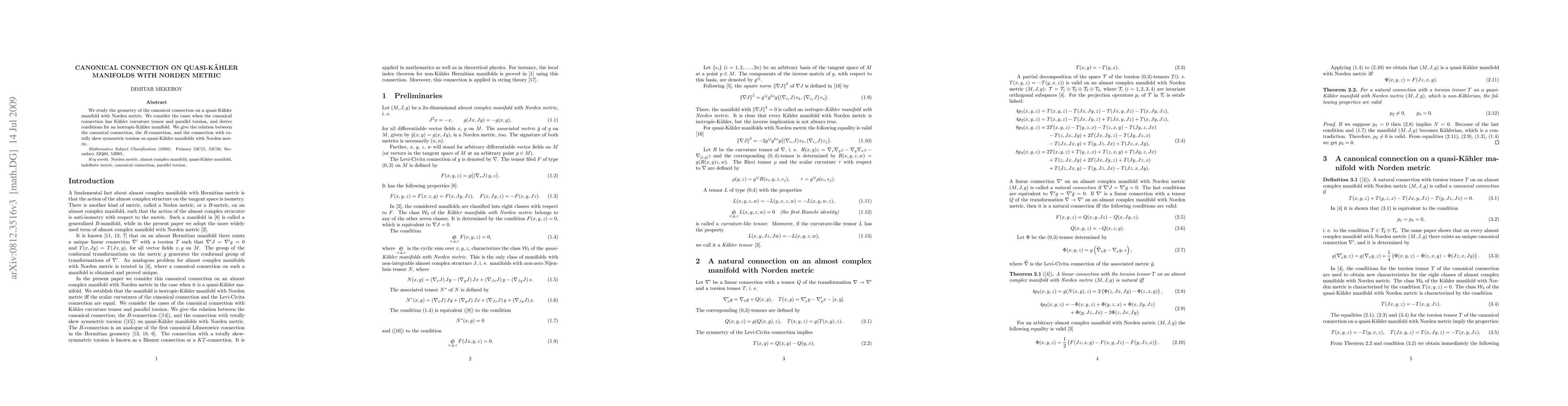 This paper investigates the geometry of the canonical connection on quasi-Kaehler manifolds equipped with a Norden metric, focusing on cases where the connection has Kähler curvature tensor and parallel torsion, and derives conditions for isotropic-Kähler manifolds. It also explores the relationships between the canonical connection, the B-connection, and the connection with totally skew-symmetric torsion.