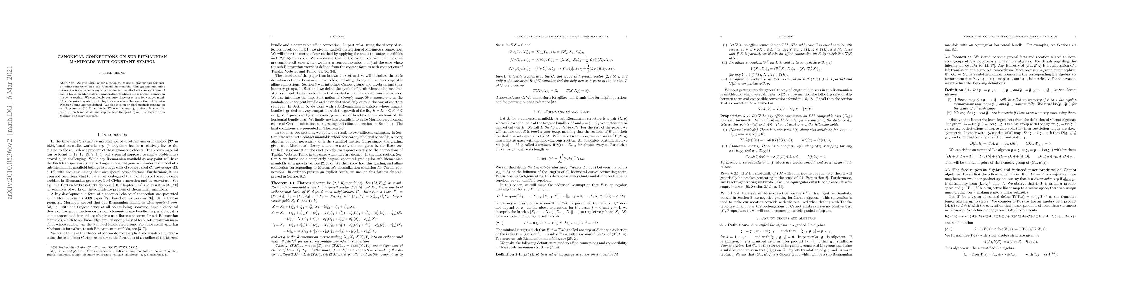 We give formulas for a canonical choice of grading and compatible affine connection on a sub-Riemannian manifold. This grading and affine connection is available on any sub-Riemannian manifold with constant symbol and is based on Morimoto's normalization condition for a Cartan connection in such a setting. We completely compute these structures for contact manifolds of constant symbol, including the cases where the connections of Tanaka-Webster-Tanno are not defined. We also give an original intrinsic grading on sub-Riemannian (2,3,5)-manifolds. We use this grading to give a flatness theorem for such manifolds and explain how the grading and connection from Morimoto's theory compare.