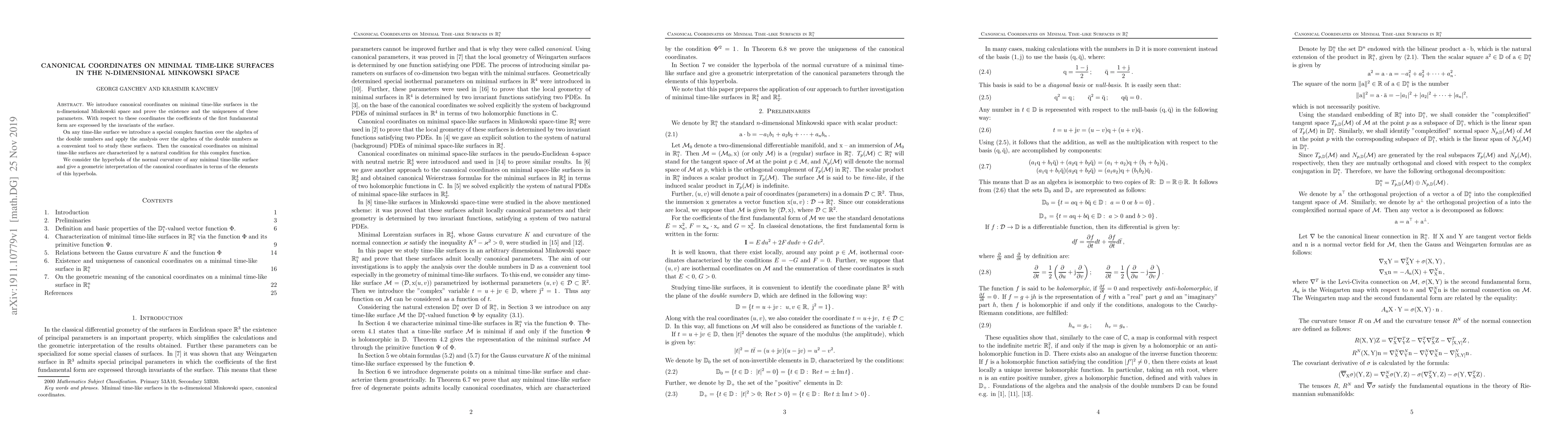 This paper introduces canonical coordinates on minimal time-like surfaces in n-dimensional Minkowski space, proving their existence and uniqueness. It utilizes complex functions over the algebra of double numbers to characterize these coordinates geometrically via the hyperbola of normal curvature.