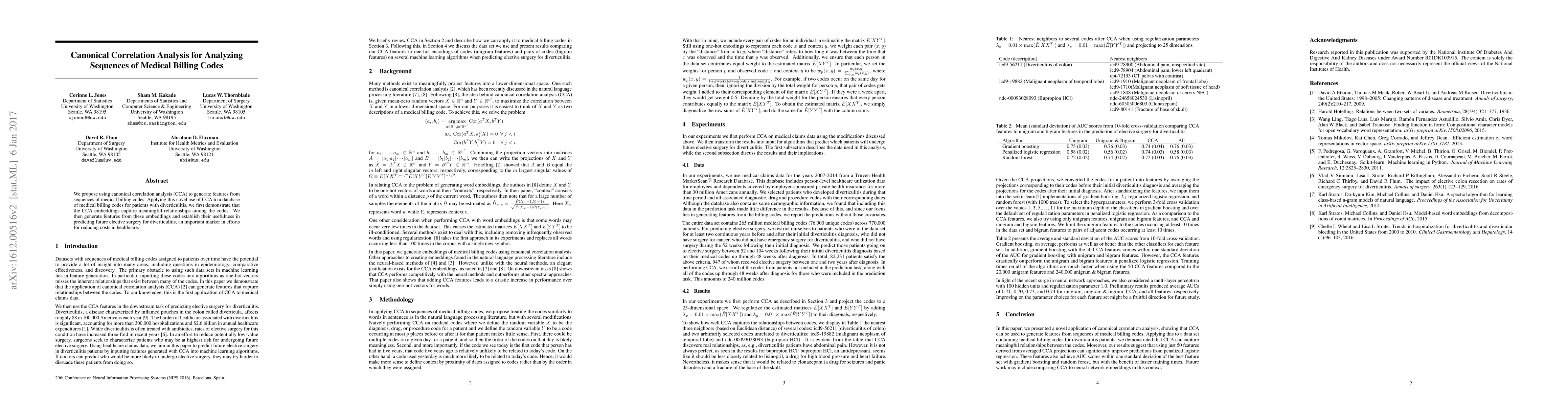 We propose using canonical correlation analysis (CCA) to generate features from sequences of medical billing codes. Applying this novel use of CCA to a database of medical billing codes for patients with diverticulitis, we first demonstrate that the CCA embeddings capture meaningful relationships among the codes. We then generate features from these embeddings and establish their usefulness in predicting future elective surgery for diverticulitis, an important marker in efforts for reducing costs in healthcare.