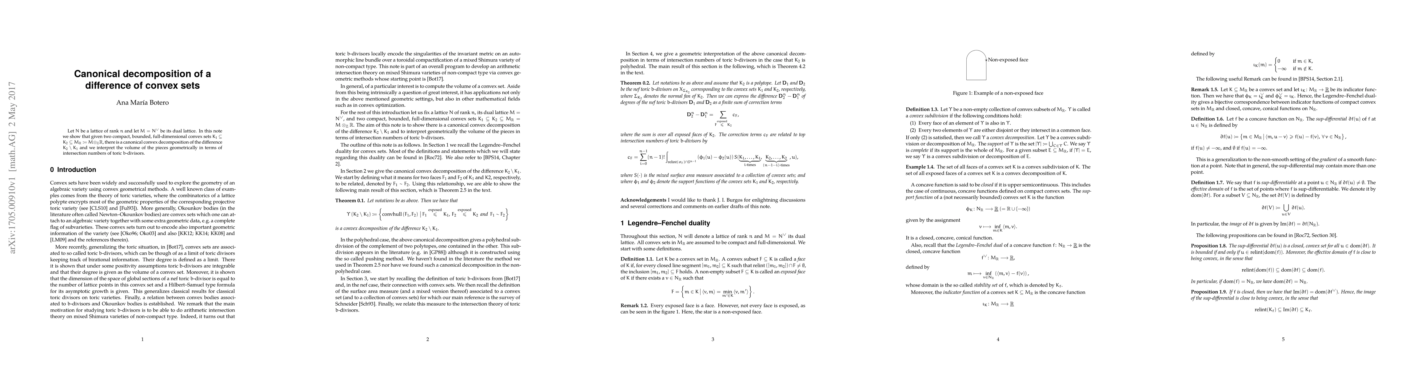 Let $N$ be a lattice of rank $n$ and let $M = N^{\vee}$ be its dual lattice. In this note we show that given two compact, bounded, full-dimensional convex sets $K_1 \subseteq K_2 \subseteq M_{\R} \coloneqq M \otimes_{\Z} \R$, there is a canonical convex decomposition of the difference $K_2 \setminus K_1$ and we interpret the volume of the pieces geometrically in terms of intersection numbers of toric $b$-divisors.