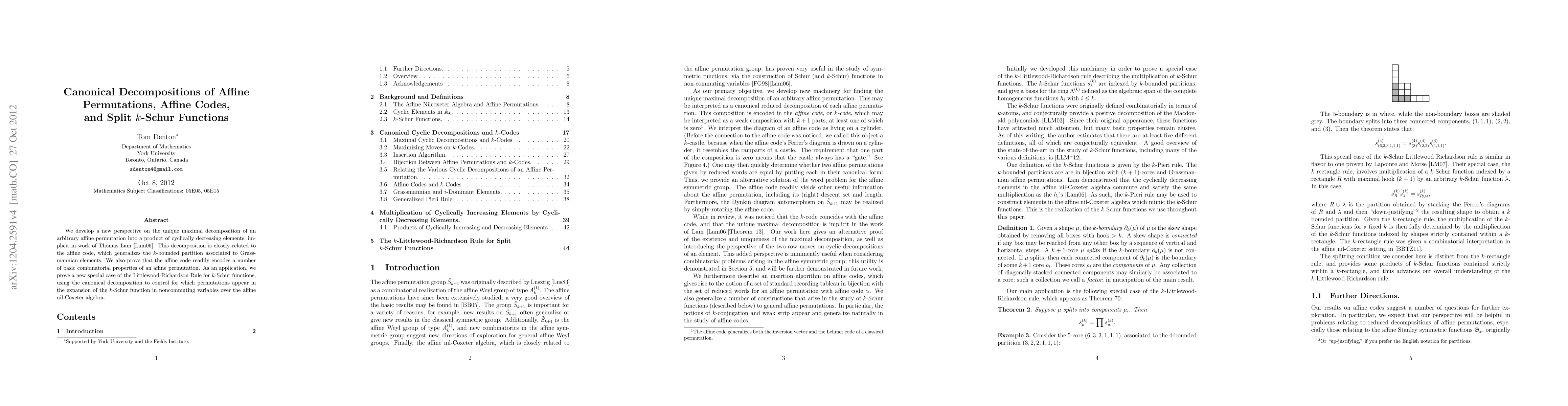 We study the unique maximal decomposition of an arbitrary affine permutation into a product of cyclically decreasing elements, providing a new perspective on work of Thomas Lam. This decomposition is closely related to the affine code, which generalizes the $k$-bounded partition associated to Grassmannian elements. We also show that the affine code readily encodes a number of basic combinatorial properties of an affine permutation. As an application, we prove a new special case of the Littlewood-Richardson Rule for $k$-Schur functions, using the canonical decomposition to control for which permutations appear in the expansion of the $k$-Schur function in noncommuting variables over the affine nil-Coxeter algebra.