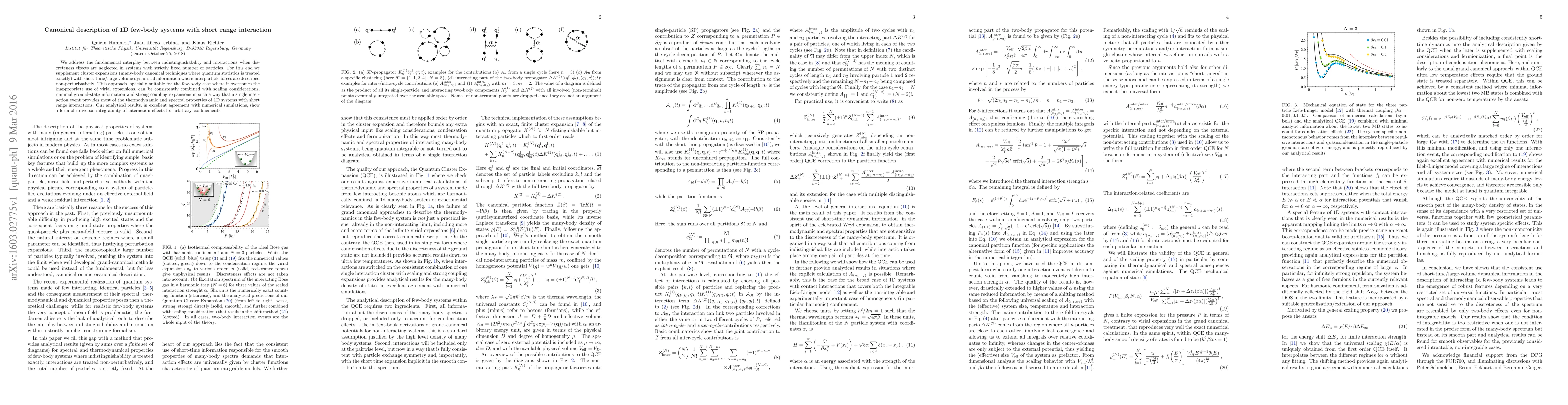 We address the fundamental interplay between indistinguishability and interactions when discreteness effects are neglected in systems with strictly fixed number of particles. For this end we supplement cluster expansions (many-body canonical techniques where quantum statistics is treated exactly) with short-time/large volume dynamical information where interparticle forces are described non-perturbatively. This approach, specially suitable for the few-body case where it overcomes the inappropriate use of virial expansions, can be consistently combined with scaling considerations, minimal ground-state information and strong coupling expansions in such a way that a single interaction event provides most of the thermodynamic and spectral properties of 1D systems with short range interactions. Our analytical results, in excellent agreement with numerical simulations, show a form of universal integrability of interaction effects for arbitrary confinements.