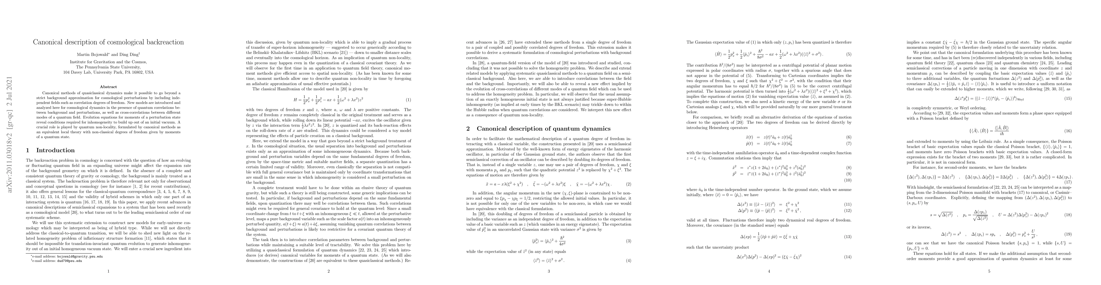 Canonical methods of quasiclassical dynamics make it possible to go beyond a strict background approximation for cosmological perturbations by including independent fields such as correlation degrees of freedom. New models are introduced and analyzed here for cosmological dynamics in the presence of quantum correlations between background and perturbations, as well as cross-correlations between different modes of a quantum field. Evolution equations for moments of a perturbation state reveal conditions required for inhomogeneity to build up out of an initial vacuum. A crucial role is played by quantum non-locality, formulated by canonical methods as an equivalent local theory with non-classical degrees of freedom given by moments of a quantum state.