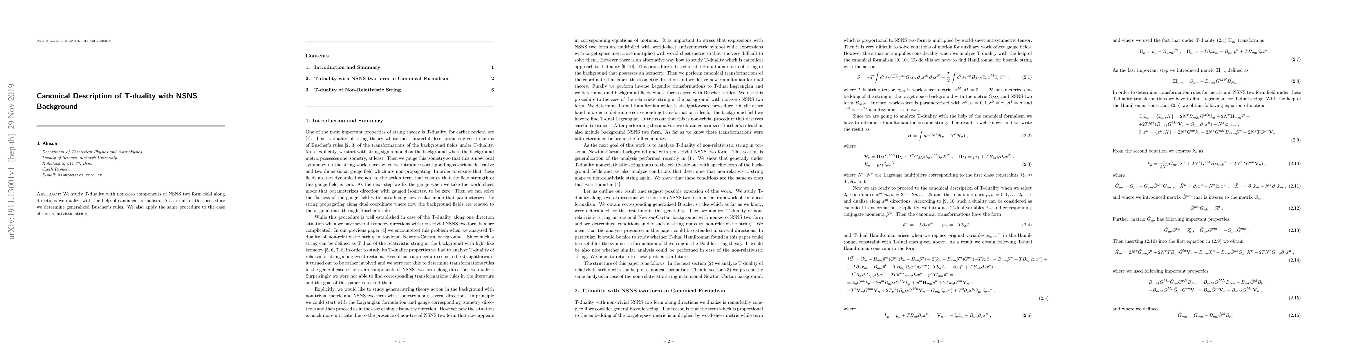 Summary: This paper explores T-duality in the presence of NSNS background fields using canonical formalism, deriving generalized Buscher's rules and applying the method to non-relativistic strings. The study provides a canonical description of T-duality in these contexts.