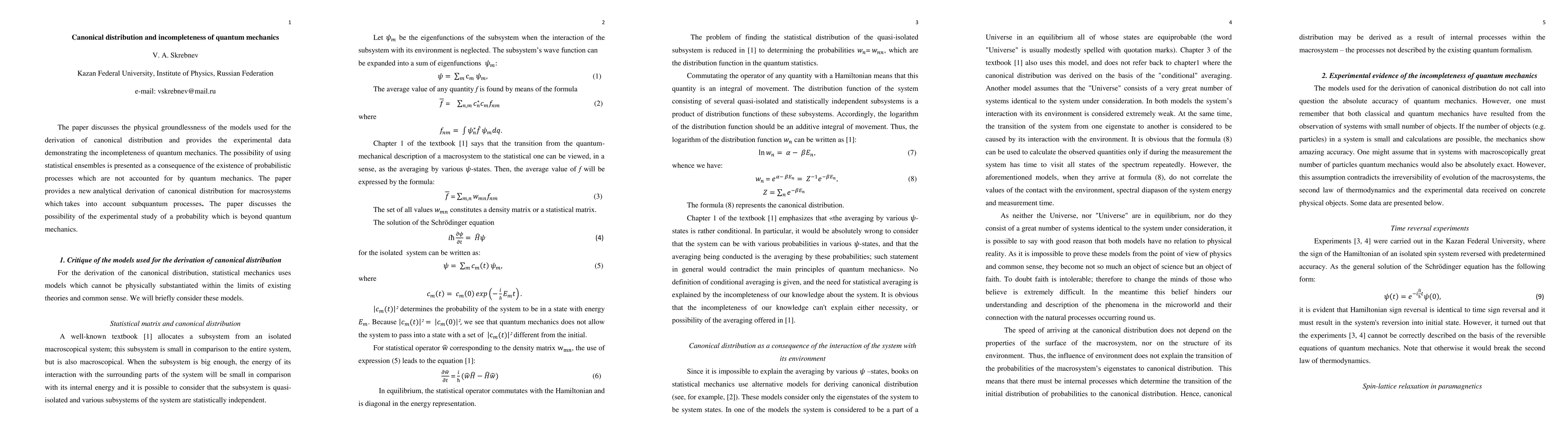 This paper argues that the canonical distribution's derivation lacks physical foundation and highlights quantum mechanics' incompleteness through experimental evidence. It proposes a new analytical approach for macrosystems that considers subquantum processes and suggests avenues for experimental study of probabilistic phenomena outside quantum mechanics.