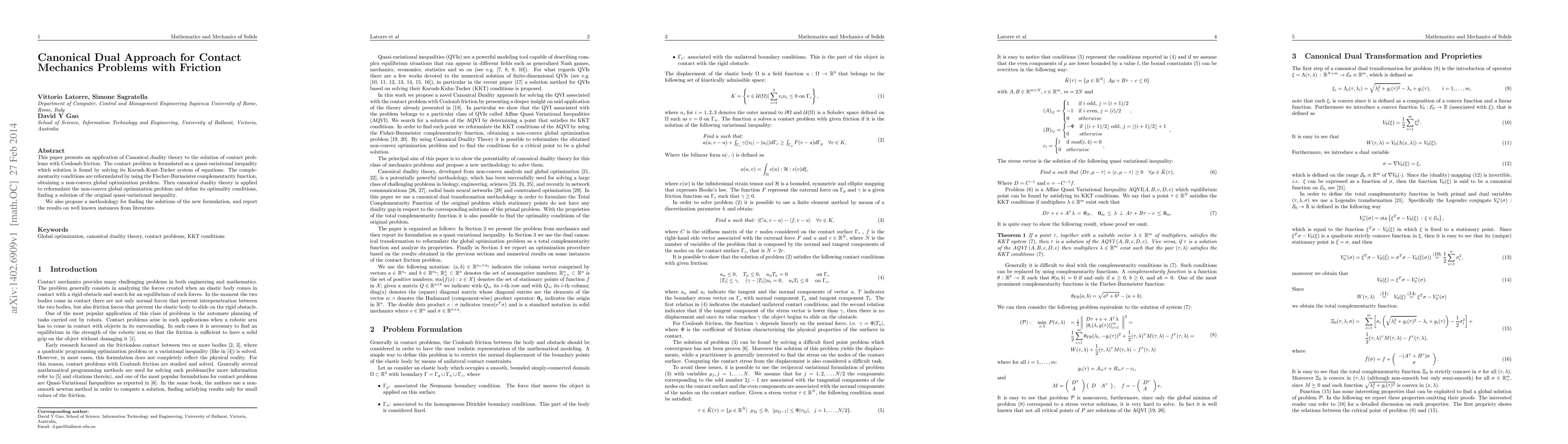 This paper presents an application of Canonical duality theory to the solution of contact problems with Coulomb friction. The contact problem is formulated as a quasi-variational inequality which solution is found by solving its Karush-Kunt-Tucker system of equations. The complementarity conditions are reformulated by using the Fischer-Burmeister complementarity function, obtaining a non-convex global optimization problem. Then canonical duality theory is applied to reformulate the non-convex global optimization problem and define its optimality conditions, finding a solution of the original quasi-variational inequality. We also propose a methodology for finding the solutions of the new formulation, and report the results on well known instances from literature.