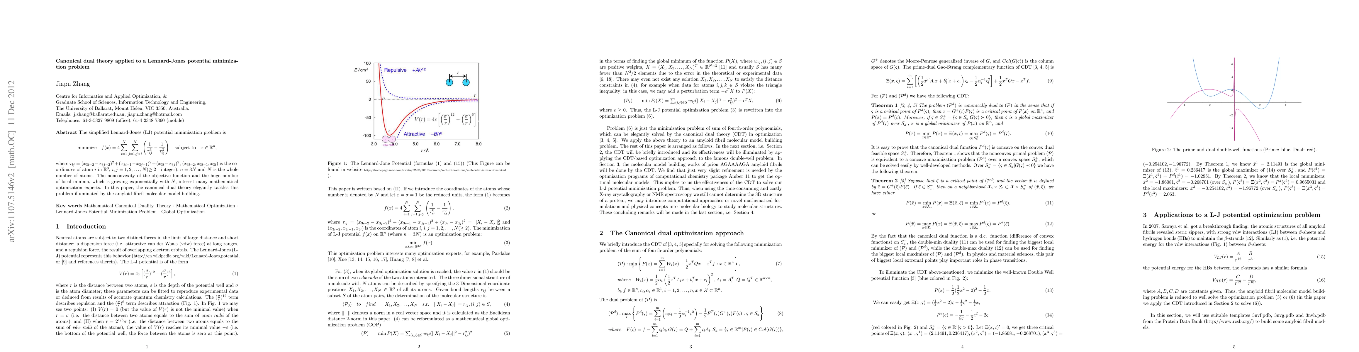 This paper applies canonical dual theory to solve the nonconvex Lennard-Jones potential minimization problem, a challenging mathematical optimization issue with exponentially growing local minima.