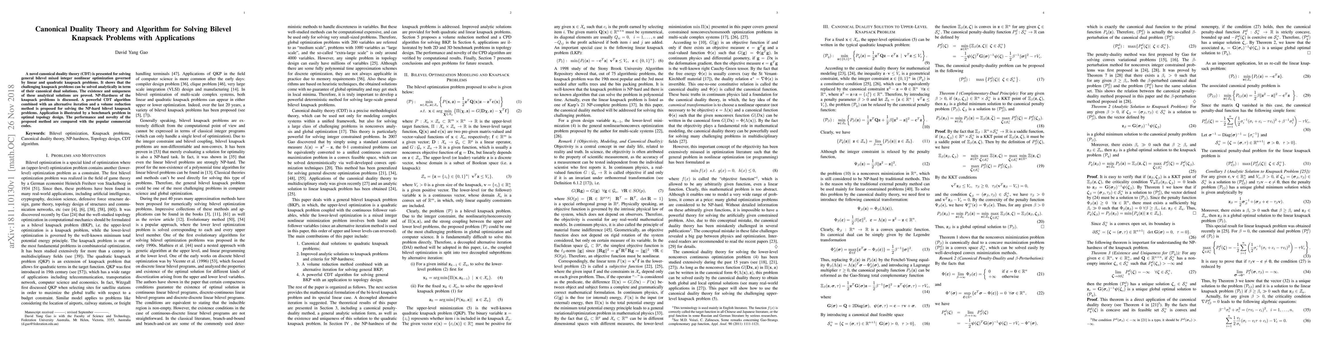 A novel canonical duality theory (CDT) is presented for solving general bilevel mixed integer nonlinear optimization governed by linear and quadratic knapsack problems. It shows that the challenging knapsack problems can be solved analytically in term of their canonical dual solutions. The existence and uniqueness of these analytical solutions are proved. NP-Hardness of the knapsack problems is discussed. A powerful CDT algorithm combined with an alternative iteration and a volume reduction method is proposed for solving the NP-hard bilevel knapsack problems. Application is illustrated by a benchmark problem in optimal topology design. The performance and novelty of the proposed method are compared with the popular commercial codes.