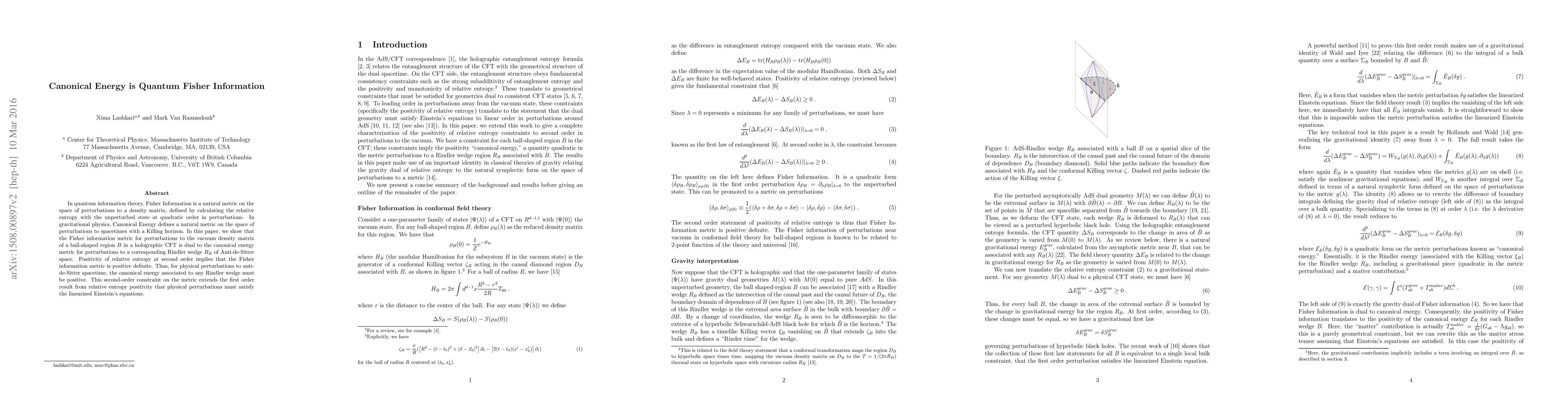 In quantum information theory, Fisher Information is a natural metric on the space of perturbations to a density matrix, defined by calculating the relative entropy with the unperturbed state at quadratic order in perturbations. In gravitational physics, Canonical Energy defines a natural metric on the space of perturbations to spacetimes with a Killing horizon. In this paper, we show that the Fisher information metric for perturbations to the vacuum density matrix of a ball-shaped region B in a holographic CFT is dual to the canonical energy metric for perturbations to a corresponding Rindler wedge R_B of Anti-de-Sitter space. Positivity of relative entropy at second order implies that the Fisher information metric is positive definite. Thus, for physical perturbations to anti-de-Sitter spacetime, the canonical energy associated to any Rindler wedge must be positive. This second-order constraint on the metric extends the first order result from relative entropy positivity that physical perturbations must satisfy the linearized Einstein's equations.