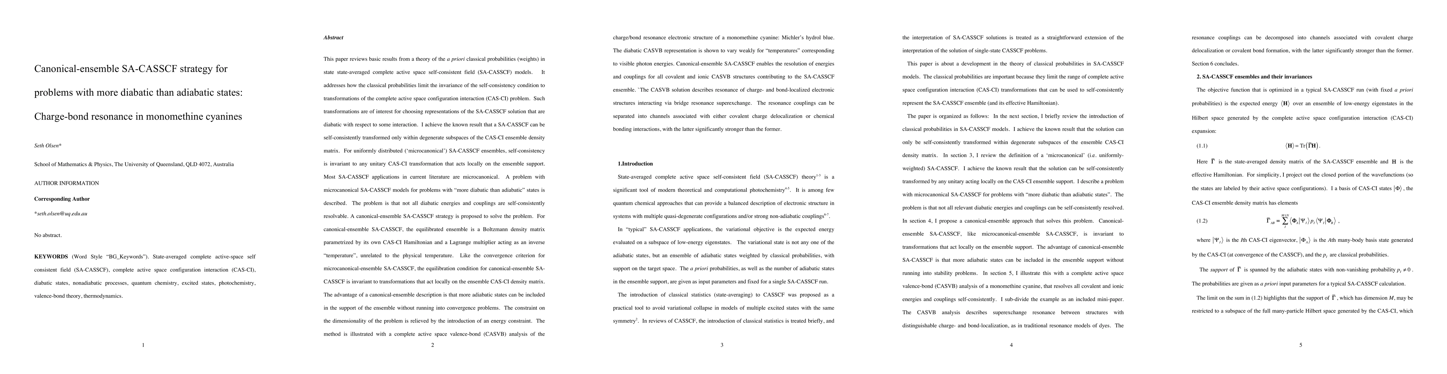 This paper reviews basic results from a theory of the classical probabilities in state-averaged complete active space self-consistent field wave functions. It is proposed that a canonical (Boltzmann) weighting scheme makes the self-consistency condition invariant with respect to configurational transformations that act locally on the support of the equilibrated SA-CASSCF ensemble. This is illustrated with a complete active space valence-bond (CASVB) analysis of low-energy electronic states in a monomethine cyanine dye.