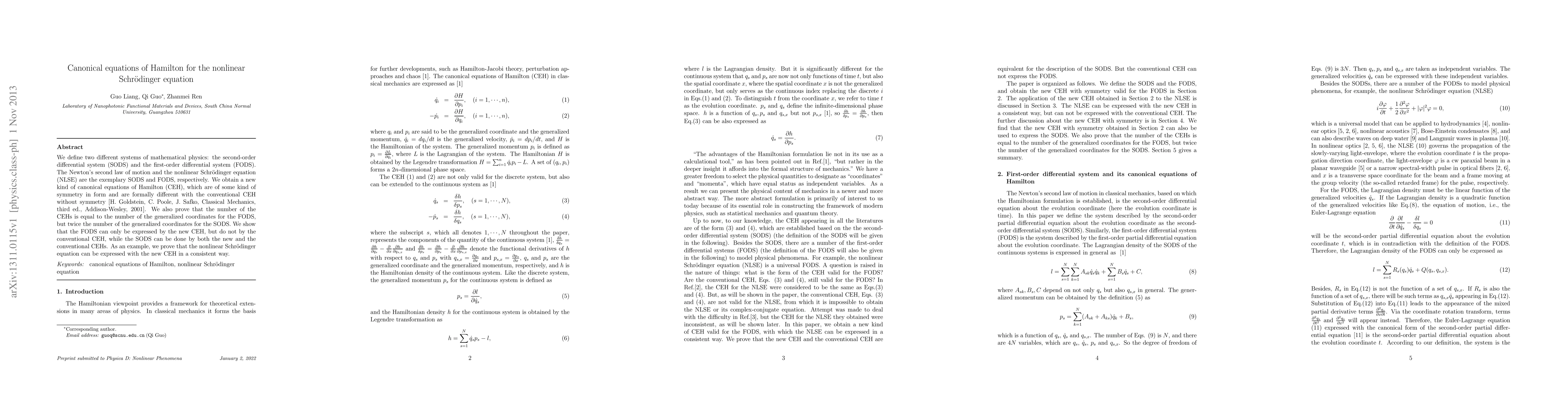 We define two different systems of mathematical physics: the second-order differential system (SODS) and the first-order differential system (FODS). The Newton's second law of motion and the nonlinear Schr\"{o}dinger equation (NLSE) are the exemplary SODS and FODS, respectively. We obtain a new kind of canonical equations of Hamilton (CEH), which are of some kind of symmetry in form and are formally different with the conventional CEH without symmetry [H. Goldstein, C. Poole, J. Safko, Classical Mechanics, third ed., Addison-Wesley, 2001]. We also prove that the number of the CEHs is equal to the number of the generalized coordinates for the FODS, but twice the number of the generalized coordinates for the SODS. We show that the FODS can only be expressed by the new CEH, but do not by the conventional CEH, while the SODS can be done by both the new and the conventional CEHs. As an example, we prove that the nonlinear Schr\"{o}dinger equation can be expressed with the new CEH in a consistent way.