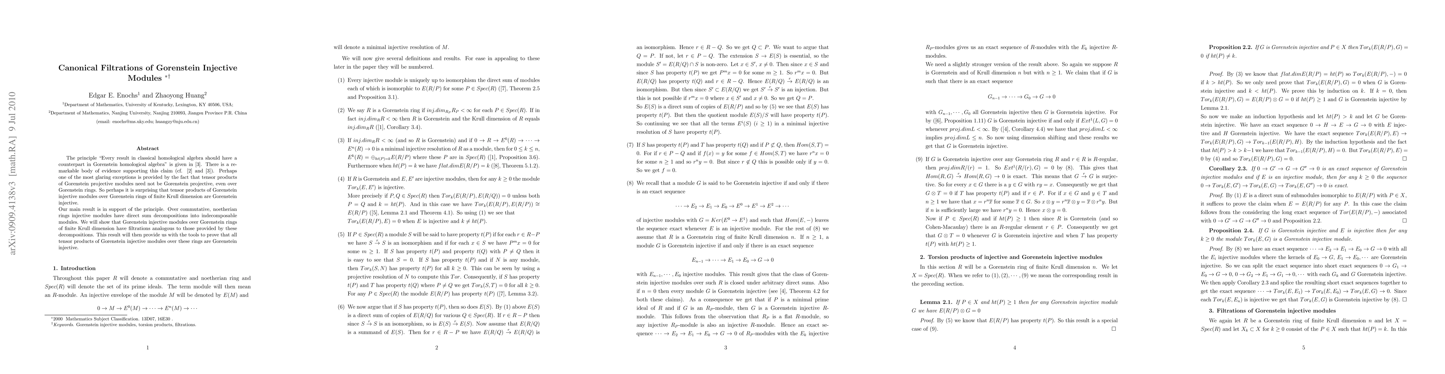 This paper establishes canonical filtrations for Gorenstein injective modules over Gorenstein rings of finite Krull dimension, proving that tensor products of such modules remain Gorenstein injective, supporting the principle that classical homological algebra results have Gorenstein counterparts.