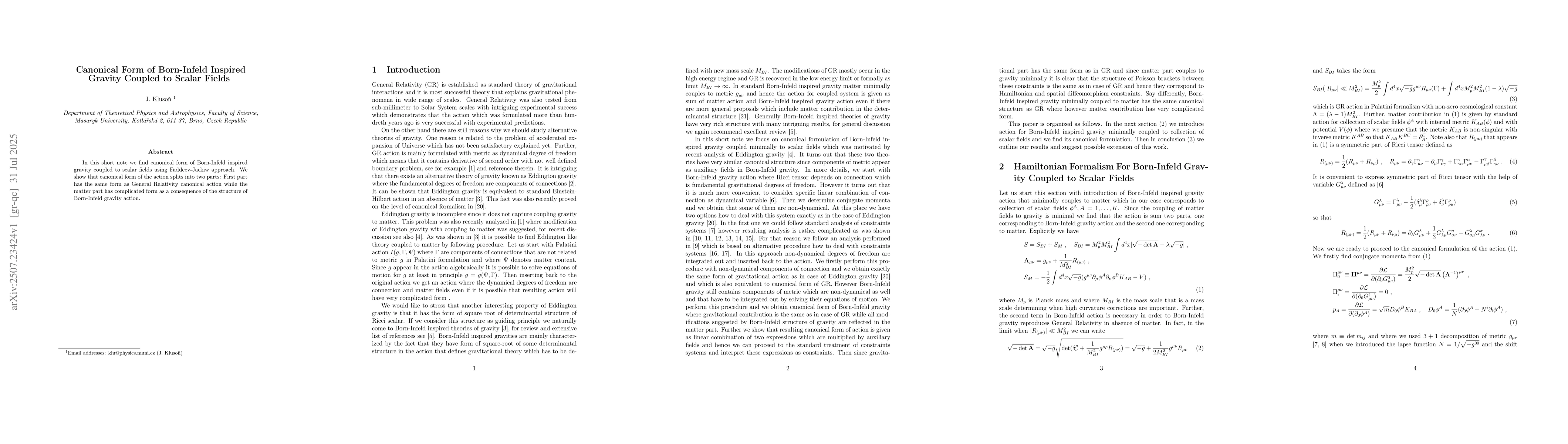 In this short note we find canonical form of Born-Infeld inspired gravity coupled to scalar fields using Faddeev-Jackiw approach. We show that canonical form of the action splits into two parts: First part has the same form as General Relativity canonical action while the matter part has complicated form as a consequence of the structure of Born-Infeld gravity action.